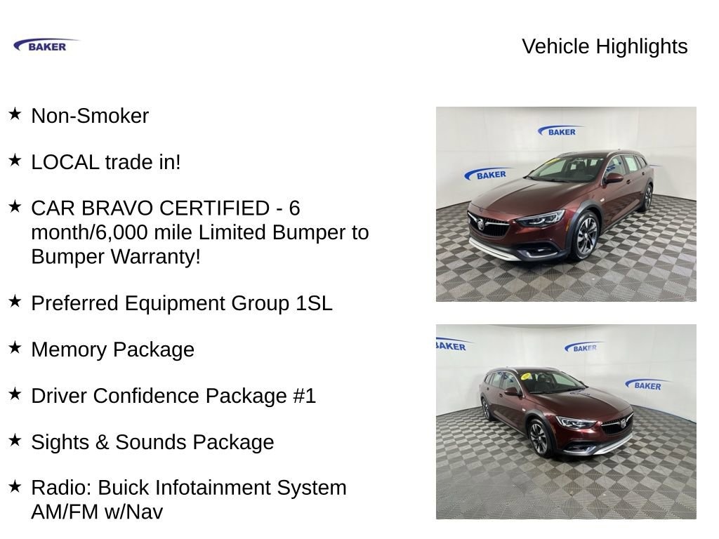 New Price! Rioja Red Metallic 2018 Buick Regal TourX Essence AWD 8-Speed Automatic 2.0L 4-Cylinder DGI DOHC VVT Turbocharged Non-Smoker, LOCAL trade in!, CAR BRAVO CERTIFIED - 6 month/6,000 mile Limited Bumper to Bumper Warranty!, Regal TourX Essence, 2.0L 4-Cylinder DGI DOHC VVT Turbocharged, 8-Speed Automatic, AWD, Rioja Red Metallic, Ebony Leather, 18 Aluminum Wheels, 2-Way Adjustable (Up/Down) Front Head Restraints, 2-Way Power Driver Lumbar Control Seat Adjuster, 2-Way Power Front Passenger Lumbar Seat Adjuster, 4-Way Power Driver Lumbar Seat Adjuster, 4-Way Power Front Passenger Lumbar Seat Adjuster, 7 Speakers, 8-Way Power Driver Seat Adjuster w/Recline, 8-Way Power Passenger Seat Adjuster, Apple CarPlay/Android Auto, Automatic temperature control, Bose Premium 8-Speaker Audio System Feature, Driver Confidence Package #1, Enhanced Speaker Audio System Feature, Exterior Parking Camera Rear, Front dual zone A/C, Heated front seats, Heated steering wheel, Lane Change Alert w/Side Blind Zone Alert, LED Headlamps, Memory Package, Power driver seat, Power Liftgate, Power passenger seat, Power-Adjustable Heated Outside Mirrors, Preferred Equipment Group 1SL, Radio: Buick Infotainment System AM/FM w/Nav, Rear Cross-Traffic Alert, Rear Storage Area Cargo Management, Sights & Sounds Package, Ultrasonic Rear Park Assist w/Audible Warning, Wireless Charging.CALL US TODAY 6168373800. Recent Arrival! Odometer is 8095 miles below market average! 21/29 City/Highway MPGAwards:* 2018 KBB.com Brand Image Awards