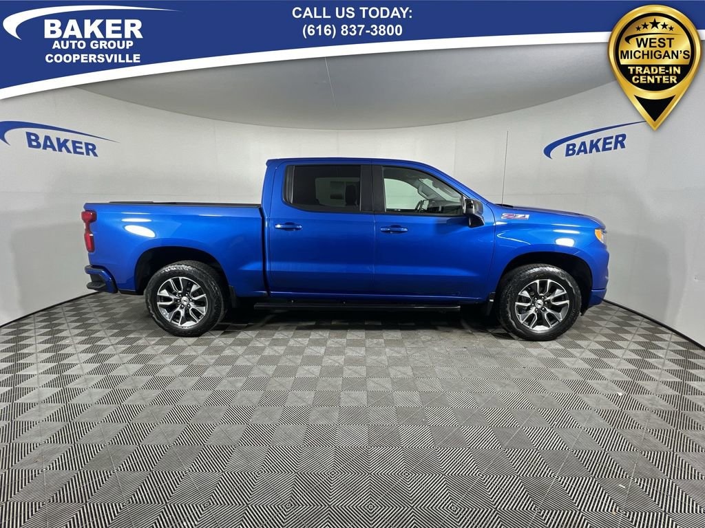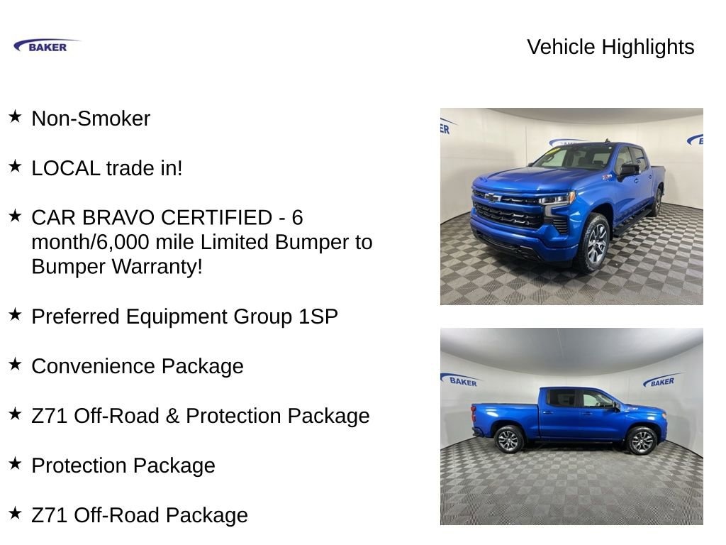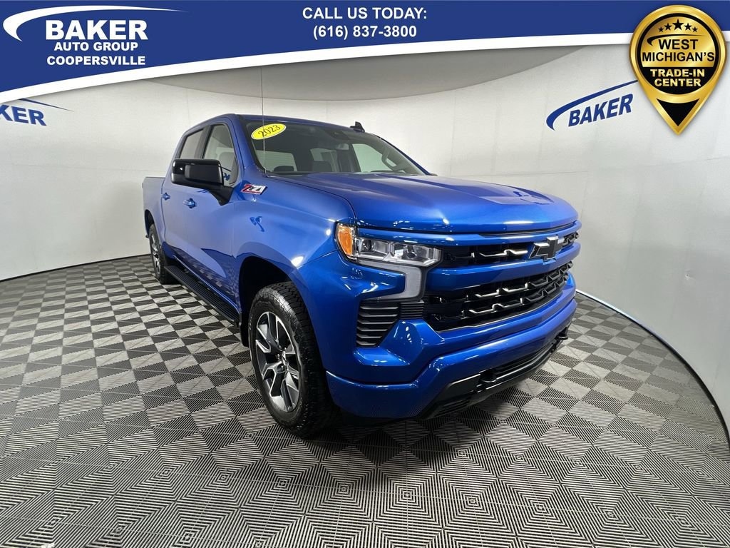New Price! Glacier Blue Metallic 2023 Chevrolet Silverado 1500 RST 4WD 10-Speed Automatic EcoTec3 5.3L V8 Non-Smoker, LOCAL trade in!, CAR BRAVO CERTIFIED - 6 month/6,000 mile Limited Bumper to Bumper Warranty!, Silverado 1500 RST, EcoTec3 5.3L V8, 10-Speed Automatic, 4WD, Glacier Blue Metallic, Black Cloth, 10-Way Power Driver Seat w/Lumbar, 12.3 Multicolor Reconfigurable Digital Display, 120-Volt Bed Mounted Power Outlet, 120-Volt Instrument Panel Power Outlet, 170 Amp Alternator, 3.23 Rear Axle Ratio, 6-Speaker Audio System, All-Star Edition, All-Weather Floor Liner (LPO) (AAK), Apple CarPlay/Android Auto, Automatic Emergency Braking, Bluetooth® For Phone, Chevytec Spray-On Black Bedliner, Convenience Package, Deep-Tinted Glass, Dual Exhaust w/Polished Outlets, Dual Rear USB Ports (Charge Only), Dual-Zone Automatic Climate Control, Electric Rear-Window Defogger, Electronic Cruise Control, EZ Lift Power Lock & Release Tailgate, Following Distance Indicator, Forward Collision Alert, Front dual zone A/C, Front Frame-Mounted Recovery Hooks, Front LED Fog Lamps, Front Pedestrian Braking, Front Rubberized Vinyl Floor Mats, HD Rear Vision Camera, Heated front seats, Heated Power-Adjustable Outside Mirrors, Heated Steering Wheel, Heavy-Duty Air Filter, High Gloss Black Mirror Caps, Hill Descent Control, Hitch Guidance, Inside Rear-View Mirror w/Tilt, Keyless Open & Start, Lane Keep Assist w/Lane Departure Warning, LED Cargo Area Lighting, Multi-Flex Tailgate, Off-Road Suspension, OnStar & Chevrolet Connected Services Capable, Power driver seat, Preferred Equipment Group 1SP, Protection Package, Rear Wheelhouse Liners, Remote Vehicle Starter System, Standard Suspension Package, Standard Tailgate, Trailering Package, Wheels: 20 x 9 Painted Aluminum, Wireless Phone Projection, Z71 Off-Road & Protection Package, Z71 Off-Road Package.