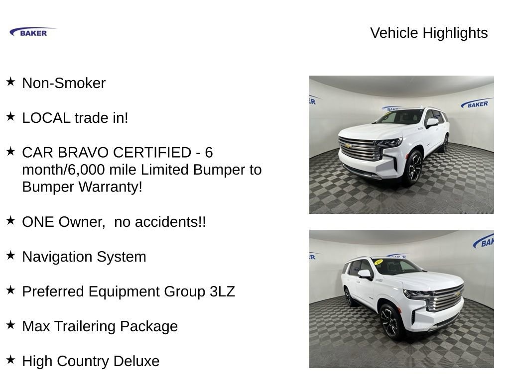 New Price! Summit White 2023 Chevrolet Tahoe High Country 4WD 10-Speed Automatic with Overdrive EcoTec3 6.2L V8 Non-Smoker, LOCAL trade in!, CAR BRAVO CERTIFIED - 6 month/6,000 mile Limited Bumper to Bumper Warranty!, ONE Owner, no accidents!!, Tahoe High Country, EcoTec3 6.2L V8, 10-Speed Automatic with Overdrive, 4WD, Summit White, Jet Black Leather, 15 Diagonal Multi-Color Head-Up Display, 1st & 2nd Row Color-Keyed Carpeted Floor Mats, 2-Speed Active Electronic AutoTrac Transfer Case, 3rd Row 60/40 Power-Folding Split-Bench Seat, Adaptive Cruise Control, Advanced Trailering Package, Air Ride Adaptive Suspension, Apple CarPlay/Android Auto, Bose 10-Speaker Centerpoint Surround Audio Sys Ft, Bright Front & Rear Door Sill Plates, Driver & Front Outboard Passenger Airbags, Dual Exhaust System, Dual-Pane Power Panoramic Sunroof, Enhanced Automatic Emergency Braking, Enhanced Driver Information Center, Exterior Parking Camera Rear, Extra Capacity Cooling System, Floor Console, Front dual zone A/C, Hands-Free Rear Power Programmable Liftgate, HD Surround Vision, Heads-Up Display, Heated 2nd Row Outboard Seats, Heated front seats, Heated rear seats, Heated Steering Wheel, High Country Deluxe, Hitch Guidance w/Hitch View, Infotainment Display, Inside Rearview Auto-Dimming Rear Camera Mirror, Integrated Trailer Brake Controller, Lane Change Alert w/Side Blind Zone Alert, LED Daytime Running Lamps, Magnetic Ride Control Suspension, Max Trailering Package, Memory seat, Memory Settings, Navigation System, Outside Heated Power-Adjustable Mirrors, Power driver seat, Power Liftgate, Power passenger seat, Power Release 2nd Row Bucket Seats, Power-Retractable Assist Steps, Preferred Equipment Group 3LZ, Premium audio system: Chevrolet Infotainment 3 Premium, Rear air conditioning, Rear Camera Mirror Washer, Rear Cross Traffic Alert, Rear Pedestrian Alert, Remote Start, Safety Alert Seat, Smart Trailer Integration Indicator, Trailer Side Blind Zone Alert, Universal Home Remote, Ventilated front seats, Wheels: 22 Black w/Selective Machining (LPO), Wireless Charging.