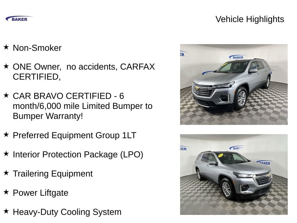 New Price! Sterling Gray Metallic 2023 Chevrolet Traverse LT 1LT AWD 9-Speed Automatic 3.6L V6 SIDI VVT Non-Smoker, ONE Owner, no accidents, CARFAX CERTIFIED,, CAR BRAVO CERTIFIED - 6 month/6,000 mile Limited Bumper to Bumper Warranty!, Traverse LT 1LT, 4D Sport Utility, 3.6L V6 SIDI VVT, AWD, Sterling Gray Metallic, Jet Black Cloth, 1st & 2nd Row All-Weather Floor Mats, 3rd Row All-Weather Floor Mats, All-Weather Cargo Mat (LPO), Heated Driver & Front Passenger Seats, Heated front seats, Heavy-Duty Cooling System, Hitch Guidance w/Hitch View, Interior Protection Package (LPO), Power Liftgate, Preferred Equipment Group 1LT, Trailering Assist Guidelines, Trailering Equipment, Wheels: 18 Bright Silver-Painted Aluminum.