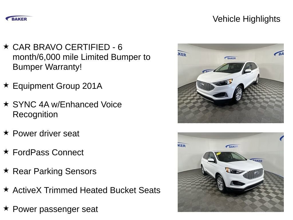 Oxford White 2024 Ford Edge SEL AWD 8-Speed Automatic EcoBoost 2.0L I4 GTDi DOHC Turbocharged VCT CAR BRAVO CERTIFIED - 6 month/6,000 mile Limited Bumper to Bumper Warranty!, Edge SEL, EcoBoost 2.0L I4 GTDi DOHC Turbocharged VCT, 8-Speed Automatic, AWD, Oxford White, Ebony Premium Synthetic, ActiveX Trimmed Heated Bucket Seats, Equipment Group 201A, FordPass Connect, Power driver seat, Power passenger seat, Rear Parking Sensors, SYNC 4A w/Enhanced Voice Recognition, Wheels: 18 Sparkle Silver-Painted Aluminum.