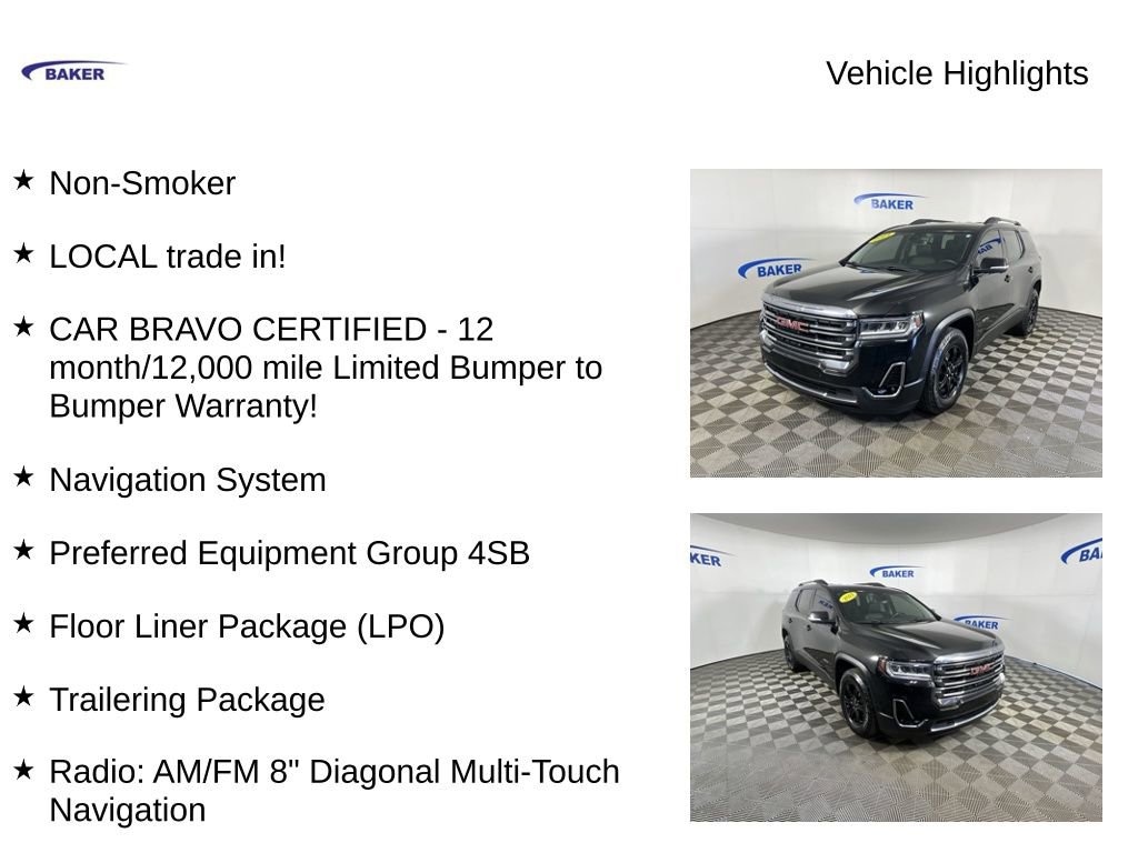 Ebony Twilight Metallic 2021 GMC Acadia AT4 AWD 9-Speed Automatic 3.6L V6 SIDI Non-Smoker, LOCAL trade in!, CAR BRAVO CERTIFIED - 12 month/12,000 mile Limited Bumper to Bumper Warranty!, Acadia AT4, 3.6L V6 SIDI, 9-Speed Automatic, AWD, 170 Amp Alternator, 1st & 2nd Row All-Weather Floor Liner (LPO), 3rd Row All-Weather Floor Liner (LPO), 4-Way Manual Passenger Seat Adjuster, 6-Passenger (2-2-2 Seating Configuration), 8-Way Power Driver Seat Adjuster, 8-Way Power Passenger Seat Adjuster, Apple CarPlay/Android Auto, Automatic temperature control, Black Center Caps w/Red GMC Logo (LPO), Bose Premium 8-Speaker Audio System Feature, Dual SkyScape 2-Panel Power Sunroof, Floor Liner Package (LPO), Front dual zone A/C, HD Radio, Heated front seats, Heavy-Duty Cooling System, Hitch Guidance w/Hitch View, Navigation System, Power Driver Lumbar Control Seat Adjuster, Power driver seat, Power Liftgate, Preferred Equipment Group 4SB, Radio: AM/FM 8 Diagonal Multi-Touch Navigation, Trailering Assist Guidelines, Trailering Package, Wheels: 17 Gloss Black Aluminum, Wireless Apple CarPlay/Wireless Android Auto.CALL US TODAY 6168373800. Recent Arrival! 19/26 City/Highway MPG