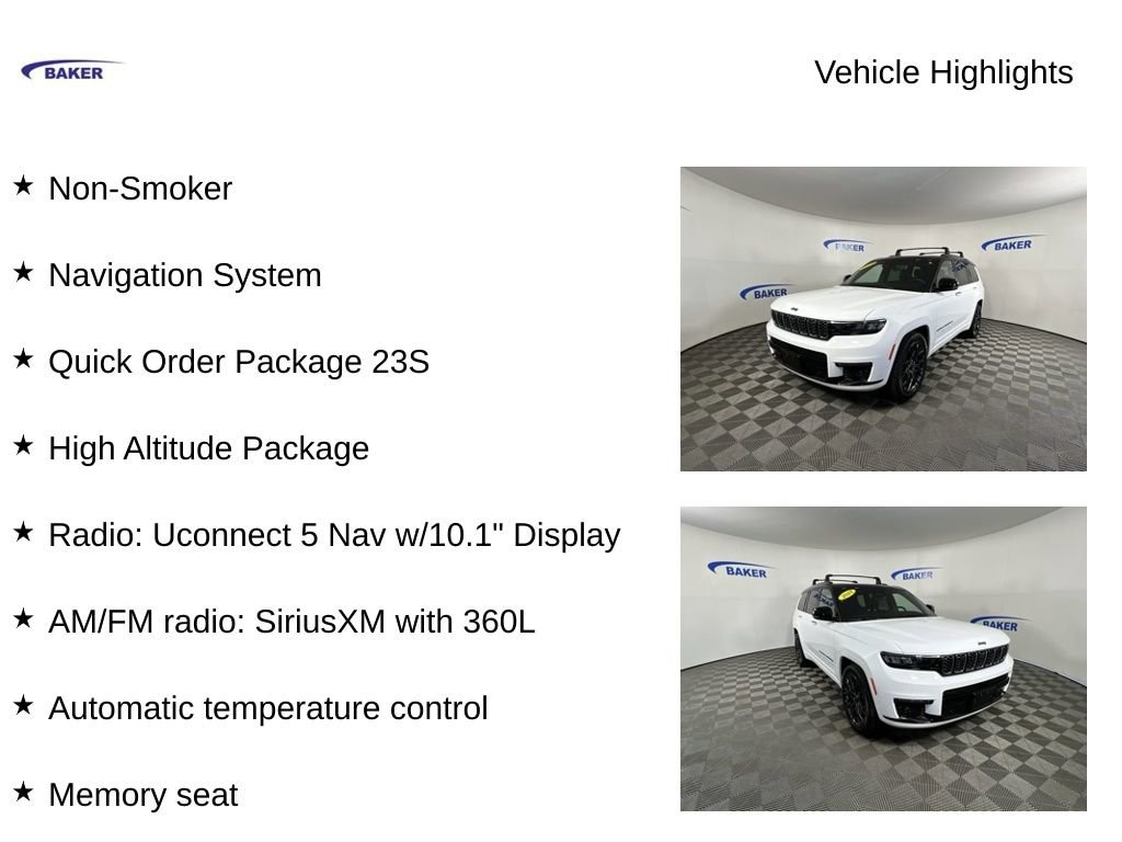New Price! Bright White Clearcoat 2024 Jeep Grand Cherokee L Summit 4WD 8-Speed Automatic 3.6L V6 24V VVT Non-Smoker, Grand Cherokee L Summit, 4D Sport Utility, 3.6L V6 24V VVT, 4WD, Adaptive suspension, AM/FM radio: SiriusXM with 360L, Auto High-beam Headlights, Automatic temperature control, Front Bucket Seats, Fully automatic headlights, Gloss Black Exterior Accents, Heated front seats, Heated rear seats, Heated steering wheel, High Altitude Package, Memory seat, Nappa Leather Seats, Navigation System, Neutral Gray Exterior Accents, Painted Door Cladding, Power Fold Seatbacks, Power Liftgate, Power moonroof, Quick Order Package 23S, Radio: Uconnect 5 Nav w/10.1 Display, Rain sensing wipers, Reclining 3rd row seat, Ventilated front seats, Wheels: 21 x 9 Black Painted Aluminum.