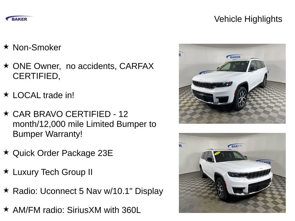 New Price! Bright White Clearcoat 2024 Jeep Grand Cherokee L Limited 4WD 8-Speed Automatic 3.6L V6 24V VVT Non-Smoker, ONE Owner, no accidents, CARFAX CERTIFIED,, LOCAL trade in!, CAR BRAVO CERTIFIED - 12 month/12,000 mile Limited Bumper to Bumper Warranty!, Grand Cherokee L Limited, 3.6L V6 24V VVT, 8-Speed Automatic, 4WD, Bright White Clearcoat, 2nd Row Manual Window Shades, AM/FM radio: SiriusXM with 360L, Auto-Dimming Exterior Driver Mirror, Automatic temperature control, Dual-Pane Panoramic Sunroof, Front dual zone A/C, Heated front seats, Heated rear seats, Integrated Off-Road Camera, Interior Rear Facing Camera, Intersection Collision Assist System, Luxury Tech Group II, Memory seat, ParkSense Front/Rear Park Assist w/Stop, ParkView Rear Back-Up Camera, Passive Entry - Front/Rear Doors, Liftgate, Power driver seat, Power Liftgate, Power passenger seat, Quick Order Package 23E, Radio: Uconnect 5 Nav w/10.1 Display, Rain Sensitive Windshield Wipers, Rear Back Up Camera Washer, Rearview Autodim Digital Display Mirror, Surround View Camera System, Ventilated Front Seats, Wheels: 18 x 8.0 Polished/Painted Aluminum, Wireless Charging Pad.