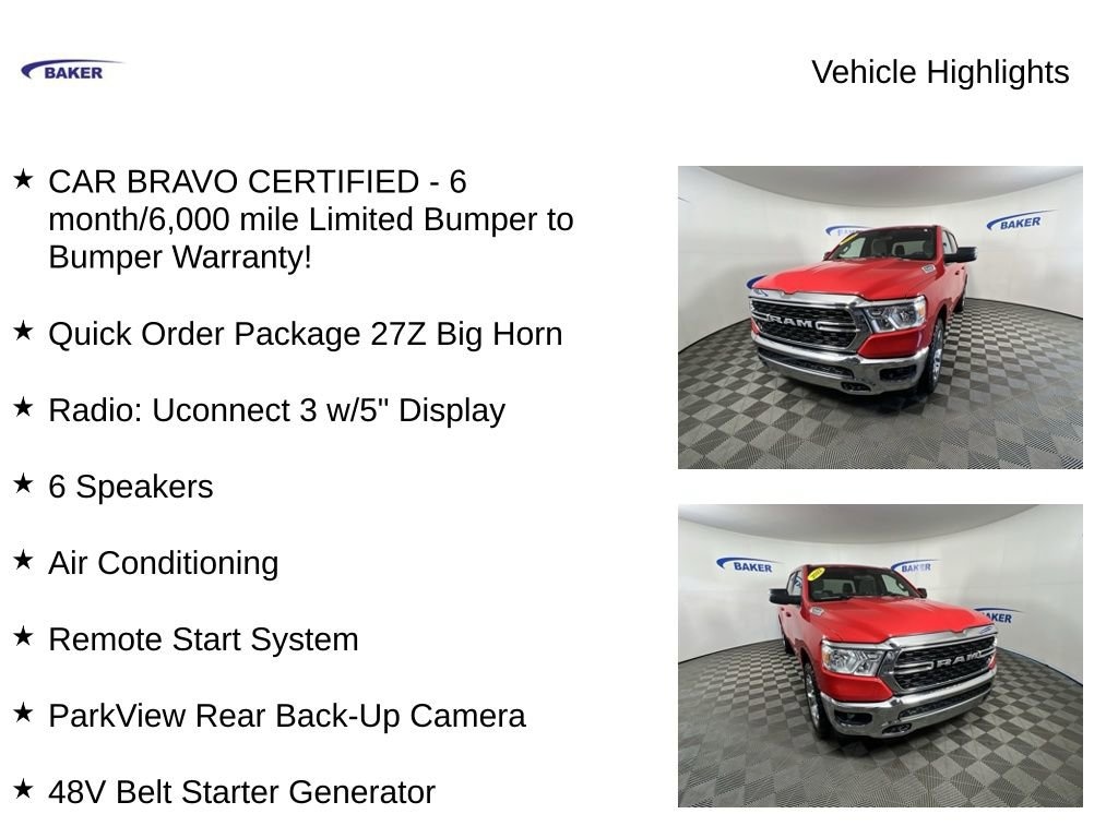 New Price! Flame Red Clearcoat 2022 Ram 1500 Big Horn/Lone Star 4WD 8-Speed Automatic HEMI 5.7L V8 Multi Displacement VVT CAR BRAVO CERTIFIED - 6 month/6,000 mile Limited Bumper to Bumper Warranty!, 1500 Big Horn/Lone Star, 4D Crew Cab, HEMI 5.7L V8 Multi Displacement VVT, 8-Speed Automatic, 4WD, Flame Red Clearcoat, 23 Gallon Fuel Tank, 3.21 Rear Axle Ratio, 48V Belt Starter Generator, 6 Speakers, Air Conditioning, Convex Wide-Angle Mirror Insert, Heated door mirrors, ParkView Rear Back-Up Camera, Quick Order Package 27Z Big Horn, Radio: Uconnect 3 w/5 Display, Rear step bumper, Remote Start System, Wheels: 20 x 9 Aluminum Chrome Clad (WRK).