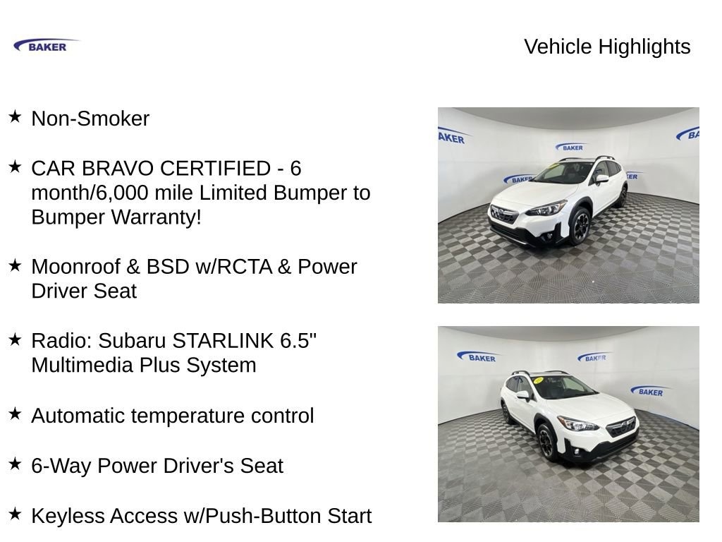 New Price! Crystal White Pearl 2023 Subaru Crosstrek Premium AWD Lineartronic CVT 2.0L 4-Cylinder DOHC 16V Non-Smoker, CAR BRAVO CERTIFIED - 6 month/6,000 mile Limited Bumper to Bumper Warranty!, Crosstrek Premium, 4D Sport Utility, 2.0L 4-Cylinder DOHC 16V, Lineartronic CVT, AWD, Crystal White Pearl, Black w/Red Stitching w/Cloth Upholstery, 6-Way Power Driver's Seat, Automatic temperature control, Blind Spot Detection w/Rear Cross-Traffic Alert, Exterior Parking Camera Rear, EyeSight System, Fully automatic headlights, Heated front seats, Keyless Access w/Push-Button Start, Moonroof & BSD w/RCTA & Power Driver Seat, Power Moonroof, Radio: Subaru STARLINK 6.5 Multimedia Plus System, STARLINK/Apple CarPlay/Android Auto, Wheels: 17 x 7.0J Alum Alloy Blk w/Machine Finish.