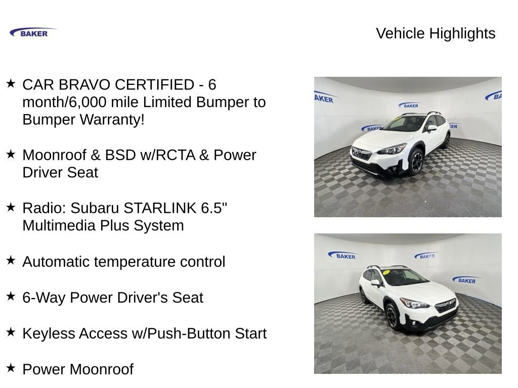 Crystal White Pearl 2023 Subaru Crosstrek Premium AWD Lineartronic CVT 2.0L 4-Cylinder DOHC 16V CAR BRAVO CERTIFIED - 6 month/6,000 mile Limited Bumper to Bumper Warranty!, Crosstrek Premium, 4D Sport Utility, 2.0L 4-Cylinder DOHC 16V, Lineartronic CVT, AWD, Crystal White Pearl, Black w/Red Stitching w/Cloth Upholstery, 6-Way Power Driver's Seat, Automatic temperature control, Blind Spot Detection w/Rear Cross-Traffic Alert, Exterior Parking Camera Rear, EyeSight System, Fully automatic headlights, Heated front seats, Keyless Access w/Push-Button Start, Moonroof & BSD w/RCTA & Power Driver Seat, Power Moonroof, Radio: Subaru STARLINK 6.5 Multimedia Plus System, STARLINK/Apple CarPlay/Android Auto, Wheels: 17 x 7.0J Alum Alloy Blk w/Machine Finish.CALL US TODAY 6168373800. Recent Arrival! 28/33 City/Highway MPG
