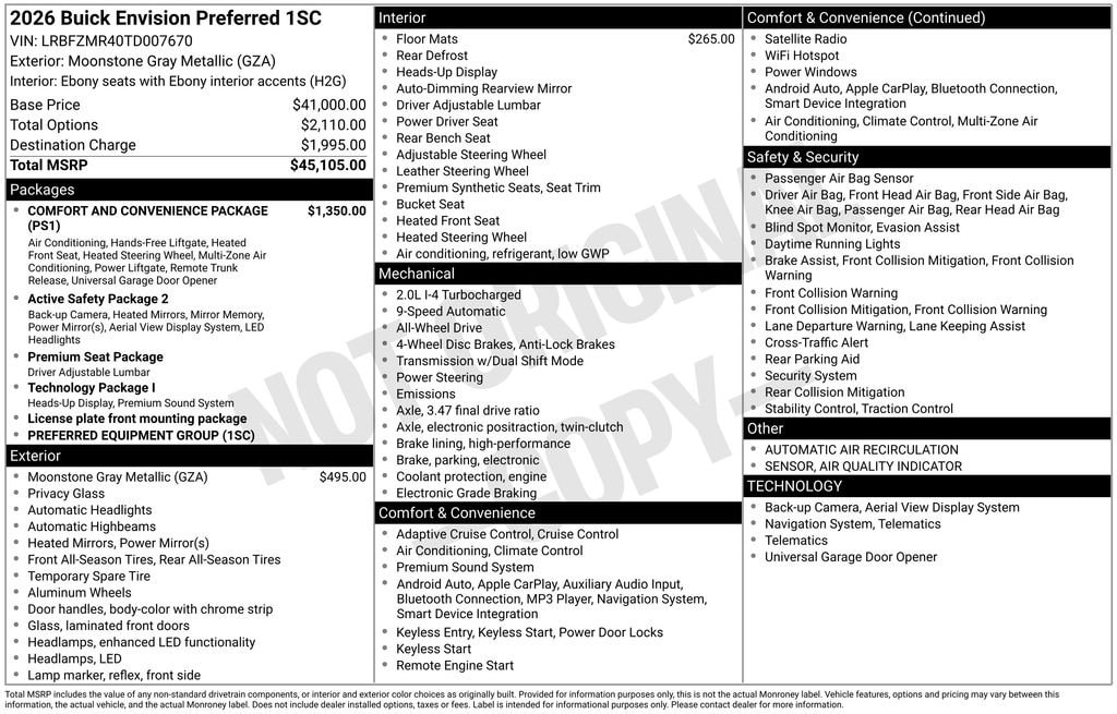 Moonstone Gray Metallic 2026 Buick Envision Preferred AWD 9-Speed Automatic 2.0L Turbocharged 3-Channel Programmable Universal Home Remote, 30 Diagonal LCD Display, 4-Wheel Disc Brakes, 9 Speakers, ABS brakes, Air Conditioning, Air Quality Indicator Sensor, AM/FM radio: SiriusXM, Auto High-beam Headlights, Auto-dimming door mirrors, Auto-dimming Rear-View mirror, Automatic Air Recirculation, Automatic temperature control, Bose Premium 9-Speaker Audio System Feature, Brake assist, Bumpers: body-color, Comfort and Convenience Package, Compass, Delay-off headlights, Driver 4-Way Power Lumbar Seat Adjuster, Driver 8-Way Power Seat Adjuster, Driver door bin, Driver vanity mirror, Dual front impact airbags, Dual front side impact airbags, Dual-Zone Automatic Climate Control Air Conditioning, Ebony 1st and 2nd Rows All-Weather Floor Liners (LPO), Electronic Stability Control, Emergency communication system: OnStar and Buick connected services capable, Exterior Parking Camera Rear, Four wheel independent suspension, Front anti-roll bar, Front Bucket Seats, Front Center Armrest, Front Passenger 6-Way Manual Seat Adjuster, Front reading lights, Fully automatic headlights, Hands-Free Power Programmable Liftgate, Heads-Up Display, Heated door mirrors, Heated Driver and Front Passenger Seats, Heated Steering Wheel, Illuminated entry, Knee airbag, Leather steering wheel, Low tire pressure warning, Memory seat, Navigation System, Occupant sensing airbag, Outside temperature display, Overhead airbag, Overhead console, Panic alarm, Passenger vanity mirror, Perforated Leatherette Seat Trim, Power door mirrors, Power driver seat, Power Liftgate, Power steering, Power windows, Preferred Equipment Group 1SC, Premium audio system: Buick Infotainment System, Radio: Infotainment Center, Rear anti-roll bar, Rear reading lights, Rear seat center armrest, Rear window defroster, Rear window wiper, Remote keyless entry, Security system, SiriusXM Trial Subscription, Speed control, Split folding rear seat, Steering wheel mounted audio controls, Telescoping steering wheel, Tilt steering wheel, Traction control, Trip computer, Variably intermittent wipers, Wheels: 18 Alloy with Technical Gray, Wireless Apple CarPlay/Wireless Android Auto.
