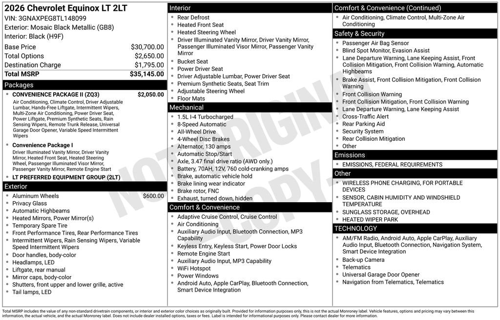 Mosaic Black Metallic 2026 Chevrolet Equinox LT AWD 8-Speed Automatic 1.5L DOHC Equinox LT, 4D Sport Utility, 1.5L DOHC, AWD, Mosaic Black Metallic, 2-Way Power Driver Lumbar Control Seat Adjuster, AutoSense Hands-Free Power Programmable Liftgate, Cabin Humidity & Windshield Sensor, Convenience Package II, Driver 8-Way Power Seat Adjuster, Dual-Zone Automatic Climate Control, Evotex Seat Trim, Heated Wiper Park, Intermittent Front Rain-Sensing Wipers, Navigation System, Overhead Sunglass Storage, Preferred Equipment Group 2LT, Programmable Universal Home Remote, Wireless Phone Charging for Portable Devices.