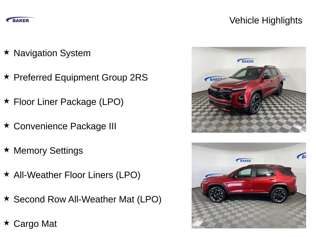 Radiant Red Tintcoat 2026 Chevrolet Equinox RS AWD 8-Speed Automatic 1.5L DOHC Equinox RS, 4D Sport Utility, 1.5L DOHC, AWD, Radiant Red Tintcoat, All-Weather Floor Liners (LPO), Cargo Mat, Convenience Package III, Floor Liner Package (LPO), Front Passenger 2-Way Power Lumbar Seat Adjuster, Front Passenger 8-Way Power Seat Adjuster, Heated Rear Outboard Seating Positions, Memory Settings, Navigation System, Preferred Equipment Group 2RS, Second Row All-Weather Mat (LPO), Ventilated Driver Seat, Ventilated Front Passenger Seat.