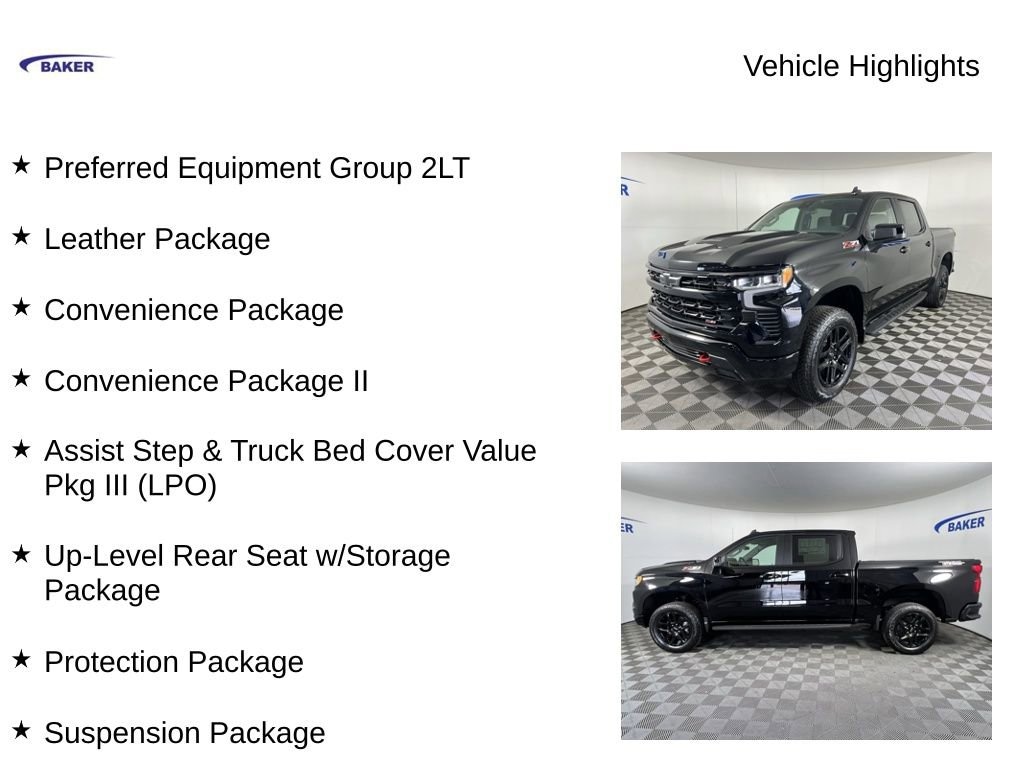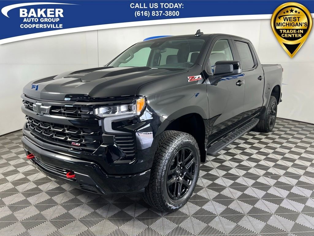 Black 2026 Chevrolet Silverado 1500 LT Trail Boss 4WD 10-Speed Automatic EcoTec3 5.3L V8 Silverado 1500 LT Trail Boss, 4D Crew Cab, EcoTec3 5.3L V8, 4WD, Black, Black Leather, 10-Way Power Driver Seat w/Lumbar, 12.3 Multicolor Reconfigurable Digital Display, 120-Volt Bed Mounted Power Outlet, 120-Volt Interior Power Outlet, 6-Speaker Audio System, All-Weather Floor Liner (LPO) (AAK), Assist Step & Truck Bed Cover Value Pkg III (LPO), Auto-Locking Rear Differential, Bluetooth® For Phone, Chevytec Spray-On Black Bedliner, Color-Keyed Carpeting Floor Covering, Convenience Package, Convenience Package II, Deep-Tinted Glass, Dual Rear USB Ports (Charge Only), Dual-Zone Automatic Climate Control, Electric Rear-Window Defogger, Electronic Cruise Control, EZ Lift Power Lock & Release Tailgate, Front LED Fog Lamps, Hard Folding Truck Bed Cover (LPO), HD Rear Vision Camera, Heated Driver & Front Outboard Passenger Seats, Heated Power-Adjustable Outside Mirrors, Heated Steering Wheel, Heavy-Duty Air Filter, High Gloss Black Mirror Caps, Hill Descent Control, Hitch Guidance, Hitch Guidance w/Hitch View, In-Vehicle Trailering System App, Inside Rear-View Mirror w/Tilt, Integrated Trailer Brake Controller, Keyless Open & Start, Leather Package, Leather-Appointed Front Seat Trim, LED Cargo Area Lighting, Manual Tilt/Telescoping Steering Column, Off-Road High Clearance Steps (LPO), OnStar Services Capable, Performance Red Recovery Hooks, Power Front Windows w/Driver Express Up/Down, Power Front Windows w/Passenger Express Down, Power Rear Windows w/Express Down, Power Sliding Rear Window w/Rear Defogger, Preferred Equipment Group 2LT, Premium Bose 7-Speaker Sound System, Protection Package, Rear 60/40 Folding Bench Seat (Folds Up), Rear Wheelhouse Liners, Remote Vehicle Starter System, SiriusXM w/360L Trial Subscription, Standard Tailgate, Steering Wheel Audio Controls, Suspension Package, Teen Driver, Theft Deterrent System (Unauthorized Entry), Tire Pressure Monitoring System, Trailering Package, Universal Home Remote, Up-Level Rear Seat w/Storage Package, Wi-Fi Hot Spot Capable, Wrapped Steering Wheel.