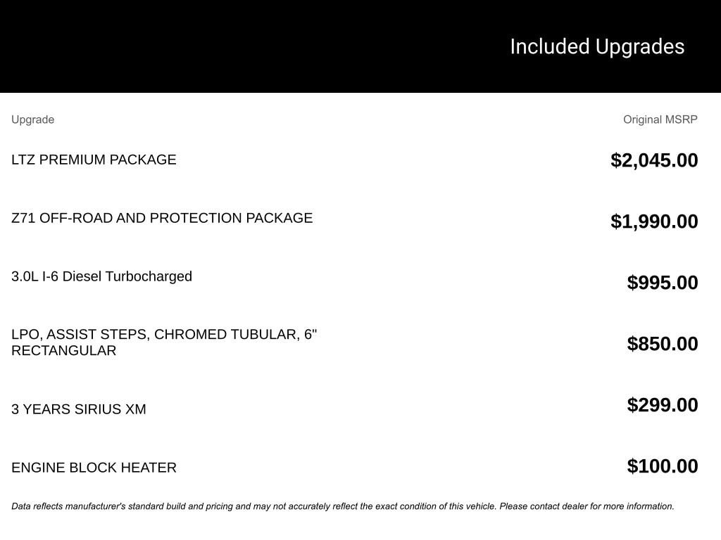Black 2026 Chevrolet Silverado 1500 LTZ 4WD 10-Speed Automatic 3.0L I6 10-Way Power Driver Seat with Lumbar, 10-Way Power Passenger Seat Adjuster with Lumbar, 12.3 Multicolor Reconfigurable Digital Display, 120-Volt Bed Mounted Power Outlet, 120-Volt Interior Power Outlet, 2 USB Data Ports, 2nd Row Heated Outboard Seats, 4-Wheel Disc Brakes, 7 Speakers, ABS brakes, Adaptive Cruise Control, Air Conditioning, All-Weather Floor Liner, AM/FM radio: SiriusXM with 360L, Apple CarPlay/Android Auto, Auto High-beam Headlights, Auto-Dimming Inside Rear-View Mirror, Auto-dimming Rear-View mirror, Auto-Locking Rear Differential, Automatic Emergency Braking, Automatic temperature control, Bluetooth® For Phone, Brake assist, Chevytec Spray-on Black Bedliner, Chrome Mirror Caps, Color-Keyed Carpeting Floor Covering, Compass, Deep-Tinted Glass, Delay-off headlights, Driver door bin, Driver Memory, Driver vanity mirror, Dual Exhaust with Black Exhaust Tips, Dual front impact airbags, Dual front side impact airbags, Dual Rear USB Ports (charge Only), Electric Rear-Window Defogger, Electronic Cruise Control, Electronic Stability Control, Emergency communication system: OnStar, Floor Mounted Center Console, Following Distance Indicator, Forward Collision Alert, Front anti-roll bar, Front Bucket Seats, Front dual zone A/C, Front fog lights, Front Frame-Mounted Recovery Hooks, Front LED Fog Lamps, Front Pedestrian Braking, Front Rain-Sensing Wipers, Front reading lights, Front Rubberized Vinyl Floor Mats, Front wheel independent suspension, Fully automatic headlights, HD Surround Vision, Heated door mirrors, Heated Driver and Front Outboard Passenger Seats, Heated front seats, Heated Steering Wheel, Heated steering wheel, Heavy-Duty Air Filter, Hill Descent Control, Hitch Guidance, Hitch Guidance with Hitch View, Illuminated entry, in-Vehicle Trailering System App, Integrated Trailer Brake Controller, IntelliBeam Automatic High Beam on/Off, Keyless Open and Start, Lane Keep Assist with Lane Departure Warning, LED Cargo Area Lighting, Low tire pressure warning, LTZ Convenience Package, LTZ Convenience Package II, LTZ Plus Package, LTZ Premium Package, Occupant sensing airbag, Off-Road Suspension, OnStar Services Capable, Outside Heated Power-Adjustable Mirrors, Outside temperature display, Overhead airbag, Overhead console, Panic alarm, Passenger vanity mirror, Perforated Leather-Appointed Front Seat Trim, Perimeter Lighting, Power door mirrors, Power driver seat, Power Front Passenger Windows with Express Up/Down, Power Front Windows with Driver Express Up/Down, Power passenger seat, Power Rear Windows with Express Down, Power Sliding Rear Window with Rear Defogger, Power steering, Power Sunroof, Power Tailgate, Power Tilt and Telescoping Steering Column, Power windows, Preferred Equipment Group 1LZ, Premium audio system: Chevrolet Infotainment 3 Premium, Premium Bose 7-Speaker Sound System, Radio data system, Radio: Chevrolet Infotainment 3 Premium System, Rain sensing wipers, Rear Cross Traffic Braking, Rear Pedestrian Alert, Rear reading lights, Rear Rubberized-Vinyl Floor Mats, Rear seat center armrest, Rear Wheelhouse Liners, Rear window defroster, Remote keyless entry, Remote Vehicle Starter System, Safety Alert Seat, Safety Package, Security system, SiriusXM with 360L Trial Subscription, Speed control, Speed-sensing steering, Split folding rear seat, Standard Tailgate, Steering Wheel Audio Controls, Steering wheel mounted audio controls, Tachometer, Teen Driver, Telescoping steering wheel, Theft Deterrent System (unauthorized Entry), Tilt steering wheel, Tire Pressure Monitoring System, Traction control, Trailer Camera Provisions, Trailer Side Blind Zone Alert, Trailering Package, Ultrasonic Front and Rear Park Assist, Universal Home Remote, Up-Level Rear Seat with Storage Package, Variably in Price includes: $1250 - Customer Cash. Exp. 04/30/2026 $3788 - Supplier Discount for Everyone. Exp.