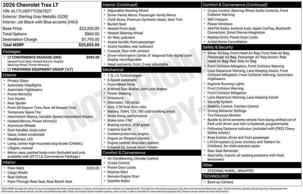 Sterling Gray Metallic 2026 Chevrolet Trax LT FWD 6-Speed Automatic ECOTEC 1.2L Turbo Trax LT, Sterling Gray Metallic, Auto High-beam Headlights, Automatic temperature control, Exterior Parking Camera Rear, Front Bucket Seats, Front Doors Keyless Open, Fully automatic headlights, Heated Driver and Front Passenger Seats, Heated Power-Adjustable Outside Mirrors, Heated Steering Wheel, LT Convenience Package, Premium audio system: Chevrolet Infotainment 3, SiriusXM Trial Subscription, Steering wheel mounted audio controls, Wrapped Steering Wheel.