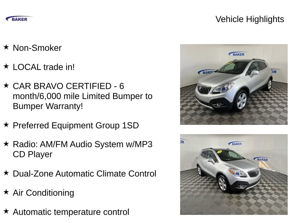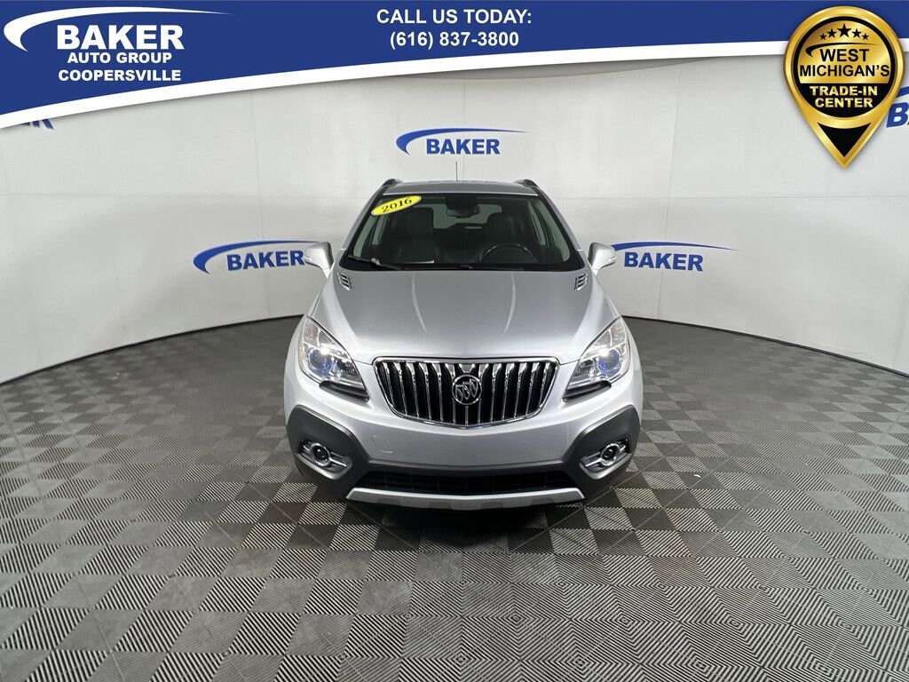 New Price! Quicksilver Metallic 2016 Buick Encore Convenience AWD 6-Speed Automatic Electronic with Overdrive ECOTEC 1.4L I4 SMPI DOHC Turbocharged VVT Non-Smoker, LOCAL trade in!, CAR BRAVO CERTIFIED - 6 month/6,000 mile Limited Bumper to Bumper Warranty!, Encore Convenience, ECOTEC 1.4L I4 SMPI DOHC Turbocharged VVT, 6-Speed Automatic Electronic with Overdrive, AWD, Quicksilver Metallic, Ebony Cloth, 120-Volt Power Outlet, 2-Way Manual Front Passenger Seat Adjuster, 6-Way Power Driver Seat Adjuster, Air Conditioning, Automatic temperature control, Dual-Zone Automatic Climate Control, Exterior Parking Camera Rear, Front Fog Lamps, Heated door mirrors, Power driver seat, Preferred Equipment Group 1SD, Radio: AM/FM Audio System w/MP3 CD Player, Rear Cross-Traffic Alert, Remote Vehicle Starter System, Side Blind Zone Alert, Wheels: 18 5-Spoke Cast Aluminum.