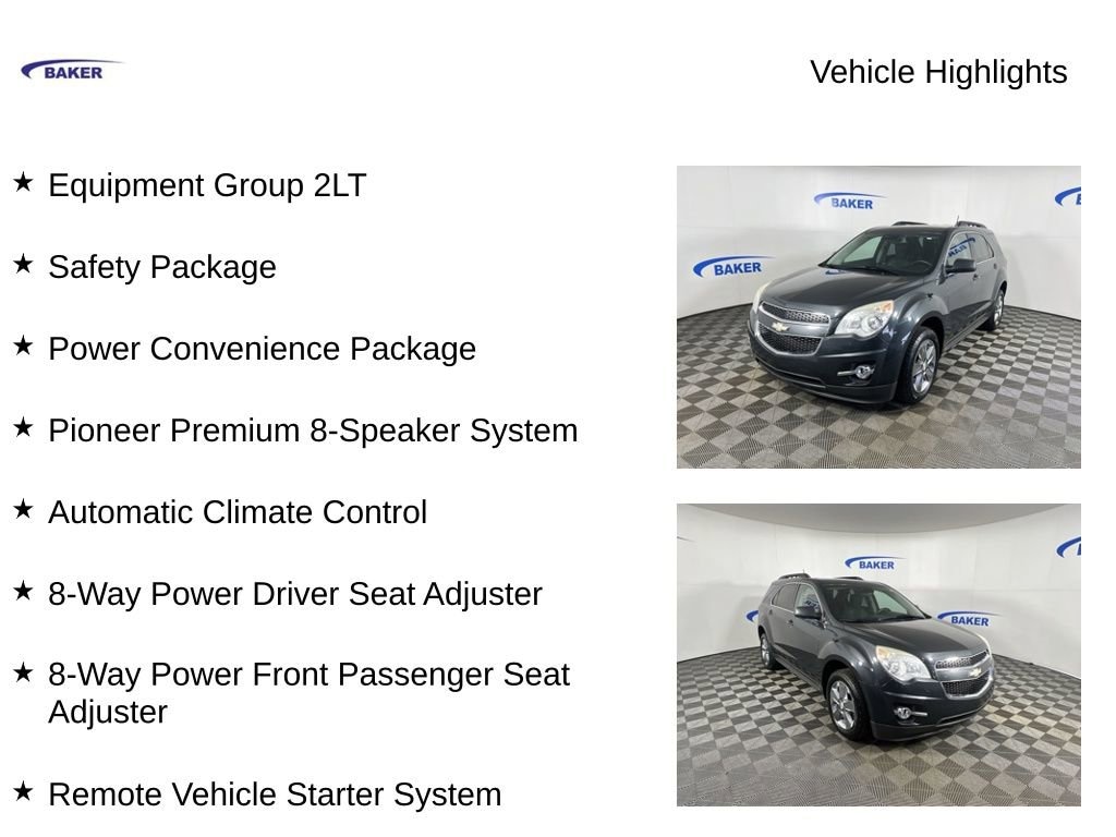 Ashen Gray Metallic 2014 Chevrolet Equinox LT 2LT AWD 6-Speed Automatic with Overdrive 2.4L 4-Cylinder SIDI DOHC Equinox LT 2LT, AWD, Ashen Gray Metallic, 18 Chrome-Clad Aluminum Wheels, 8-Way Power Driver Seat Adjuster, 8-Way Power Front Passenger Seat Adjuster, Automatic Climate Control, Equipment Group 2LT, Exterior Parking Camera Rear, Forward Collision Alert & Lane Departure Warning, Front Bucket Seats, Front Halogen Fog Lamps, Fully automatic headlights, Heated Driver & Front Passenger Seats, Inside Self-Dimming Rear-View Mirror, Pioneer Premium 8-Speaker System, Power Convenience Package, Power Programmable Rear Liftgate, Rear Park Assist, Remote Vehicle Starter System, Safety Package, Universal Home Remote.