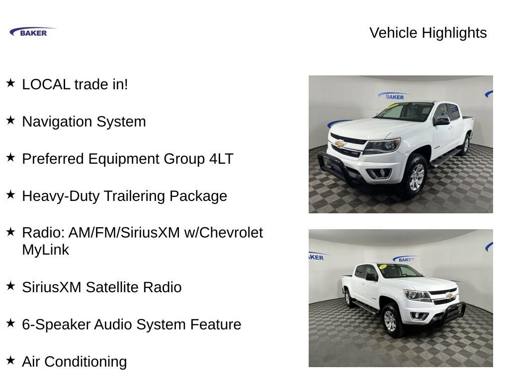 Summit White 2016 Chevrolet Colorado LT 4WD 6-Speed Automatic 3.6L 6-Cylinder DGI DOHC LOCAL trade in!, Colorado LT, 3.6L 6-Cylinder DGI DOHC, 6-Speed Automatic, 4WD, Summit White, 3.42 Rear Axle Ratio, 6-Speaker Audio System Feature, Air Conditioning, Apple CarPlay, Exterior Parking Camera Rear, Heavy-Duty Trailering Package, Navigation System, Power driver seat, Preferred Equipment Group 4LT, Radio: AM/FM/SiriusXM w/Chevrolet MyLink, SiriusXM Satellite Radio, Wheels: 17 x 8 Blade Silver Metallic Cast Alloy.
