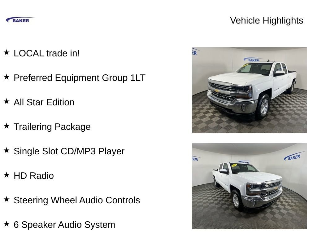 Summit White 2017 Chevrolet Silverado 1500 LT LT1 4WD 6-Speed Automatic Electronic with Overdrive EcoTec3 4.3L V6 LOCAL trade in!, Silverado 1500 LT LT1, 4D Double Cab, EcoTec3 4.3L V6, 6-Speed Automatic Electronic with Overdrive, 4WD, Summit White, Black Cloth, 110-Volt AC Power Outlet, 150 Amp Alternator, 4.2 Diagonal Color Display Driver Info Center, 6 Speaker Audio System, All Star Edition, Bluetooth® For Phone, Body Color Bodyside Moldings, Body-Color Door Handles, Body-Color Mirror Caps, Body-Color Power Adjustable Heated Outside Mirrors, Chrome Grille Surround, Color-Keyed Carpeting w/Rubberized Vinyl Floor Mats, Deep-Tinted Glass, Driver & Front Passenger Illuminated Vanity Mirrors, Dual-Zone Automatic Climate Control, Electric Rear-Window Defogger, EZ Lift & Lower Tailgate, Front Chrome Bumper, HD Radio, Leather Wrapped Steering Wheel w/Cruise Controls, Manual Tilt Wheel Steering Column, OnStar 3 Months Guidance Plan, OnStar w/4G LTE, Power Windows w/Driver Express Up, Preferred Equipment Group 1LT, Rear 60/40 Folding Bench Seat (Folds Up), Rear Chrome Bumper, Rear Vision Camera, Rear Wheelhouse Liners, Remote Keyless Entry, Remote Locking Tailgate, Remote Vehicle Starter System, Single Slot CD/MP3 Player, Steering Wheel Audio Controls, Thin Profile LED Fog Lamps, Trailering Package.