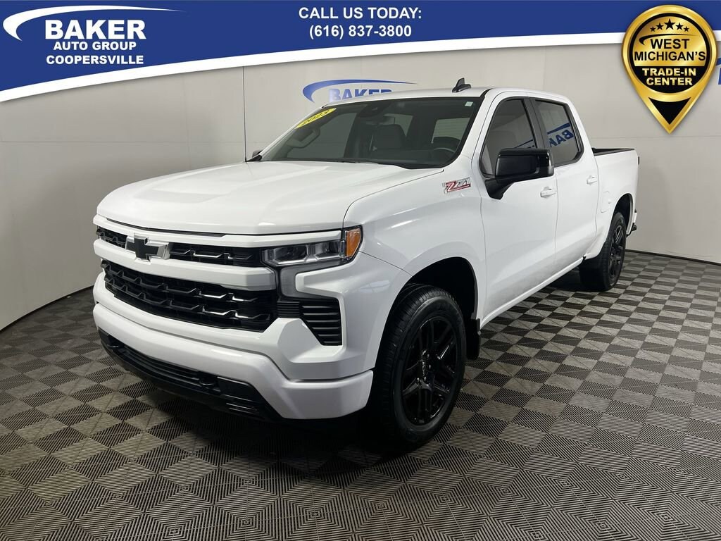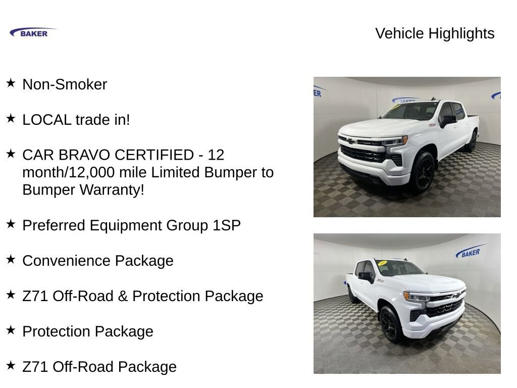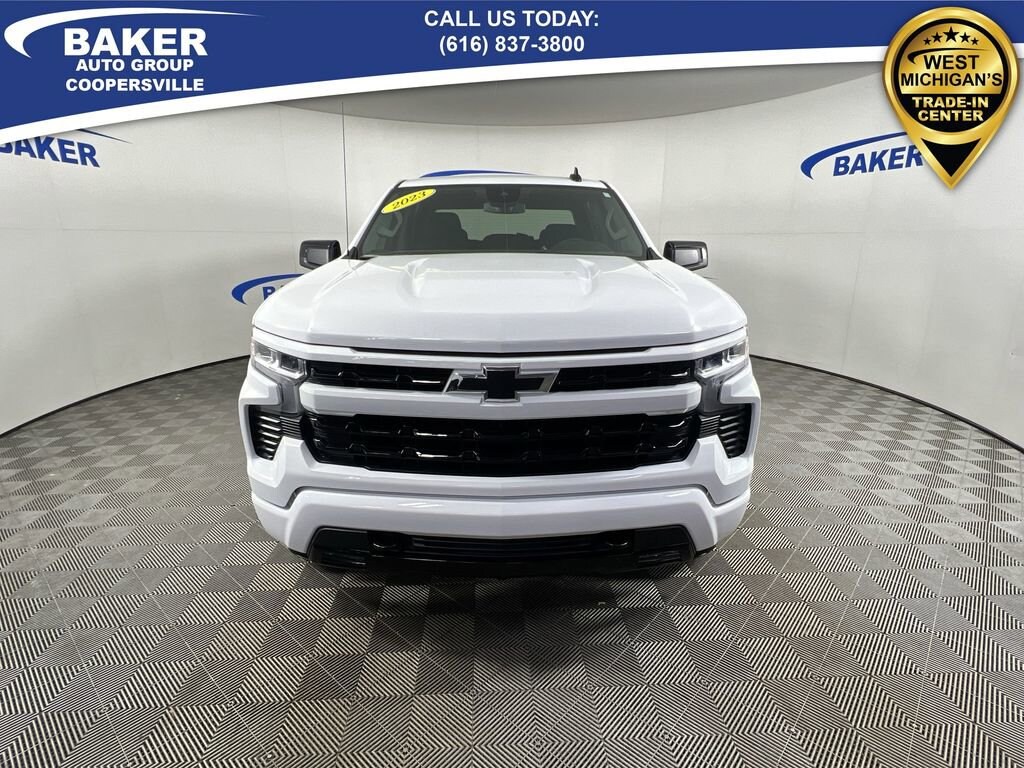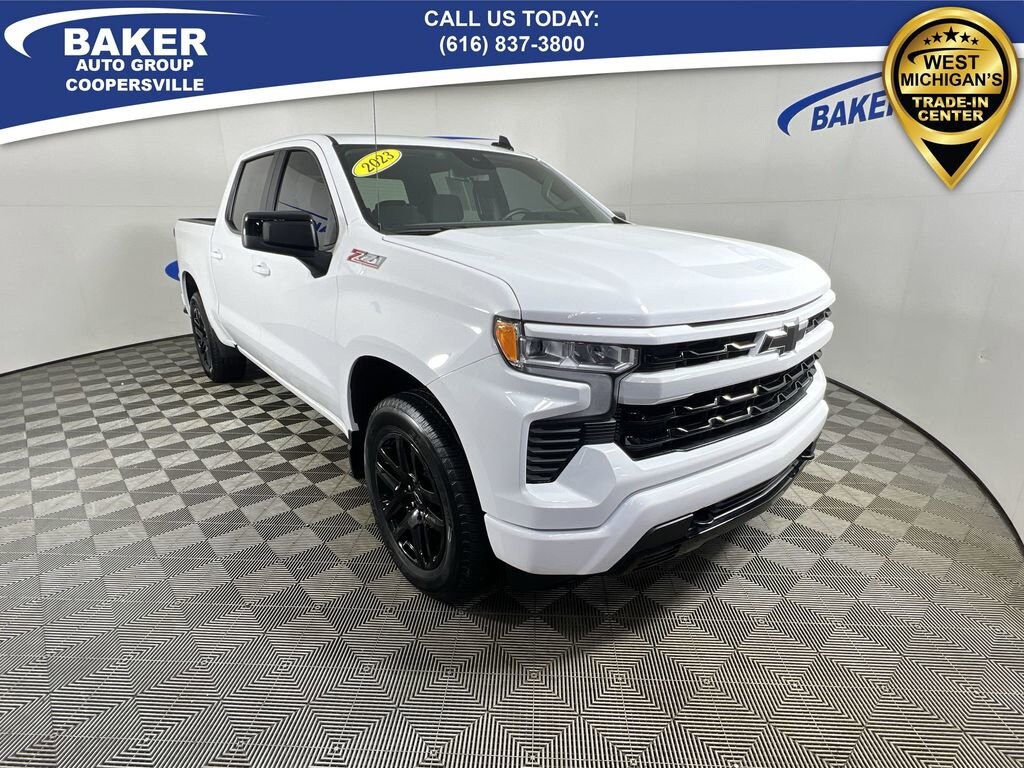 Summit White 2023 Chevrolet Silverado 1500 RST 4WD 10-Speed Automatic EcoTec3 5.3L V8 Non-Smoker, LOCAL trade in!, CAR BRAVO CERTIFIED - 12 month/12,000 mile Limited Bumper to Bumper Warranty!, Silverado 1500 RST, EcoTec3 5.3L V8, 4WD, Summit White, Black Cloth, 10-Way Power Driver Seat w/Lumbar, 12.3 Multicolor Reconfigurable Digital Display, 120-Volt Bed Mounted Power Outlet, 120-Volt Instrument Panel Power Outlet, 170 Amp Alternator, 3.23 Rear Axle Ratio, 6-Speaker Audio System, All-Star Edition, Apple CarPlay/Android Auto, Automatic Emergency Braking, Automatic temperature control, Bluetooth® For Phone, Chevytec Spray-On Black Bedliner, Compass, Convenience Package, Deep-Tinted Glass, Dual-Zone Automatic Climate Control, Electronic Cruise Control, EZ Lift Power Lock & Release Tailgate, Following Distance Indicator, Forward Collision Alert, Front Frame-Mounted Recovery Hooks, Front LED Fog Lamps, Front Pedestrian Braking, HD Rear Vision Camera, Heated front seats, Heated Power-Adjustable Outside Mirrors, Heated Steering Wheel, High Gloss Black Mirror Caps, Hitch Guidance, Inside Rear-View Mirror w/Tilt, LED Cargo Area Lighting, Off-Road Suspension, Power driver seat, Preferred Equipment Group 1SP, Protection Package, Radio: Chevrolet Infotainment 3 Premium System, Rear 60/40 Folding Bench Seat (Folds Up), Rear Rubberized-Vinyl Floor Mats, Remote Vehicle Starter System, SiriusXM w/360L, Standard Suspension Package, Trailering Package, Wheels: 20 x 9 Painted Aluminum, Wireless Phone Projection, Z71 Off-Road & Protection Package, Z71 Off-Road Package.