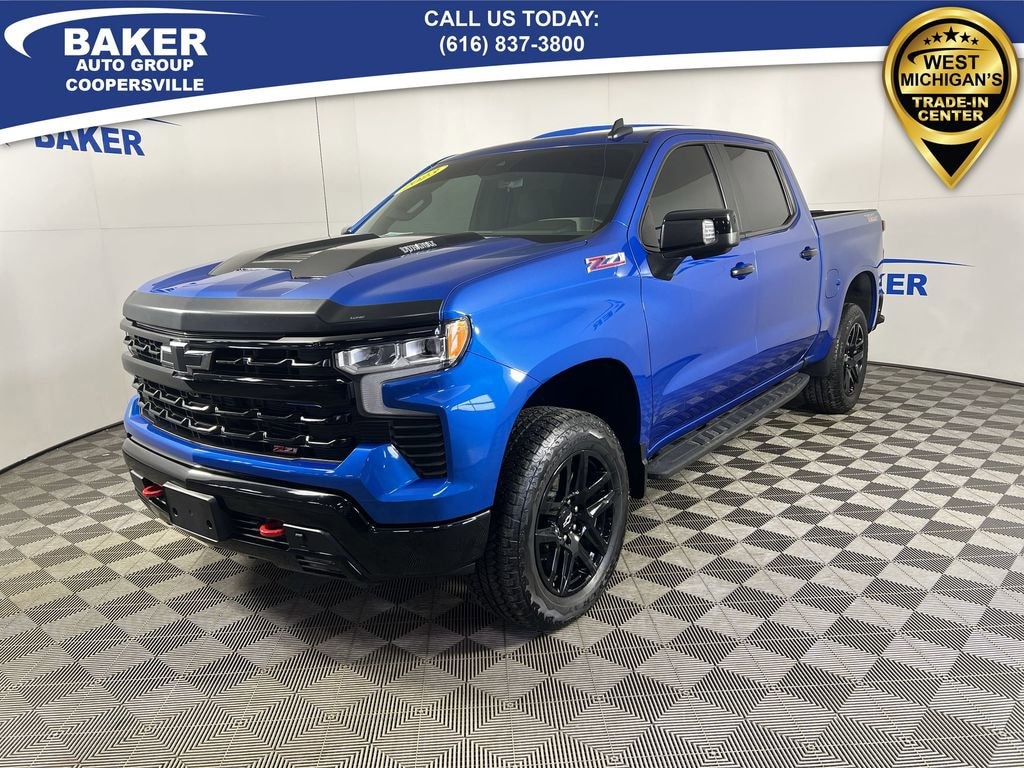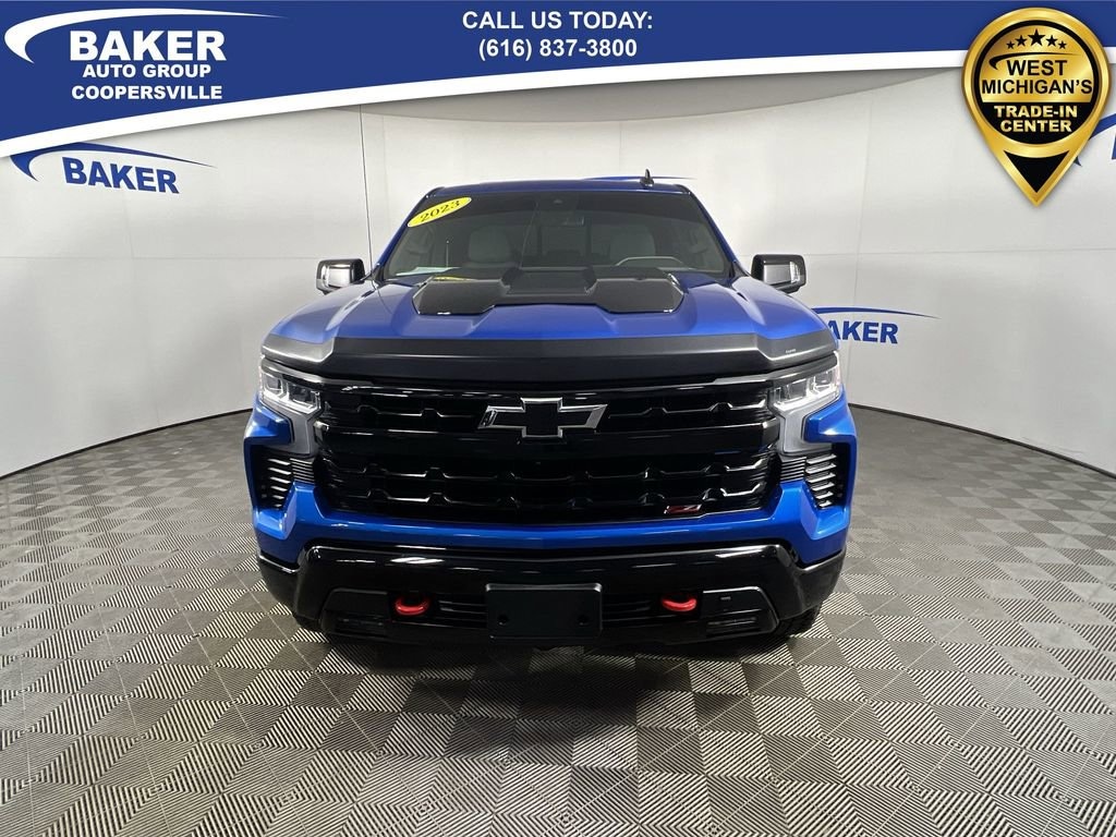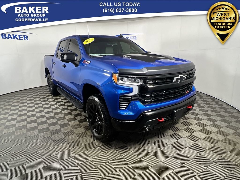 New Price! Glacier Blue Metallic 2023 Chevrolet Silverado 1500 LT Trail Boss 4WD 10-Speed Automatic 3.0L I6 Non-Smoker, LOCAL trade in!, CAR BRAVO CERTIFIED - 12 month/12,000 mile Limited Bumper to Bumper Warranty!, Silverado 1500 LT Trail Boss, 3.0L I6, 10-Speed Automatic, 4WD, Glacier Blue Metallic, Gideon/Very Dark Atmosphere Leather, 10-Way Power Driver Seat w/Lumbar, 120-Volt Bed Mounted Power Outlet, 120-Volt Instrument Panel Power Outlet, 3.23 Rear Axle Ratio, Adaptive Cruise Control, Apple CarPlay/Android Auto, Automatic Emergency Braking, Bluetooth® For Phone, Chevrolet Connected Access Capable, Chevytec Spray-On Black Bedliner, Convenience Package II, Dual Exhaust w/Polished Outlets, Dual-Zone Automatic Climate Control, Electronic Transmission Range Selector Shifter, EZ Lift Power Lock & Release Tailgate, HD Rear Vision Camera, HD Surround Vision, Heated front seats, Heated Steering Wheel, Hitch Guidance, Hitch Guidance w/Hitch View, Integrated Trailer Brake Controller, Lane Keep Assist w/Lane Departure Warning, Leather Package, LT Trail Boss Premium Package, Off-Road High Clearance Steps (LPO), Power driver seat, Power Sliding Rear Window w/Rear Defogger, Power Sunroof, Power Tailgate, Premium audio system: Chevrolet Infotainment 3 Premium, Premium Bose 7-Speaker Sound System, Protection Package, Radio: Chevrolet Infotainment 3 Premium System, Rear Park Assist, Safety Package, Trailer Camera Provisions, Trailering Package, Up-Level Rear Seat w/Storage Package, Wheels: 20 x 9 High Gloss Black Painted Alum, Wireless Charging, Wireless Phone Projection.