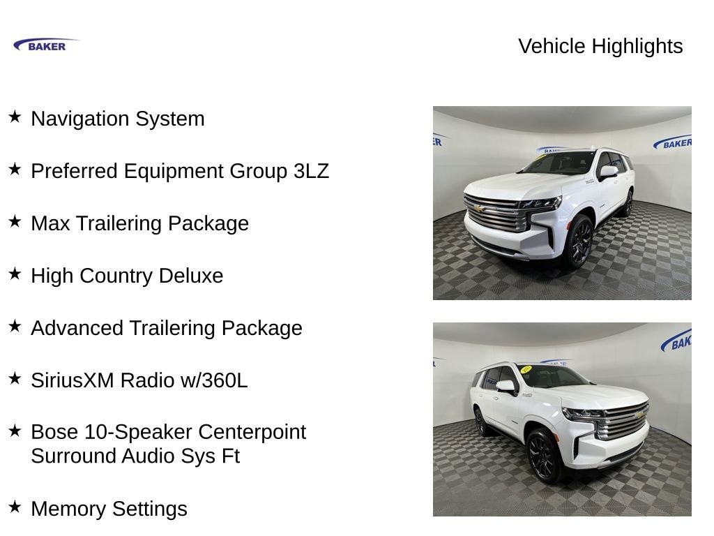 New Price! Iridescent Pearl Tricoat 2023 Chevrolet Tahoe High Country 4WD 10-Speed Automatic with Overdrive EcoTec3 6.2L V8 Tahoe High Country, 4D Sport Utility, EcoTec3 6.2L V8, 4WD, Iridescent Pearl Tricoat, Jet Black/Mocha Leather, 15 Diagonal Multi-Color Head-Up Display, 1st & 2nd Row Color-Keyed Carpeted Floor Mats, 2-Speed Active Electronic AutoTrac Transfer Case, 3rd Row 60/40 Power-Folding Split-Bench Seat, Advanced Trailering Package, Air Ride Adaptive Suspension, Bose 10-Speaker Centerpoint Surround Audio Sys Ft, Bright Front & Rear Door Sill Plates, Chrome Door Handles w/Body-Color Strip, Color-Keyed Carpeting Floor Covering, Driver & Front Outboard Passenger Airbags, Dual Exhaust System, Dual-Pane Power Panoramic Sunroof, Enhanced Automatic Emergency Braking, Enhanced Driver Information Center, Extra Capacity Cooling System, Floor Console, Hands-Free Rear Power Programmable Liftgate, HD Surround Vision, Heads-Up Display, Heated 2nd Row Outboard Seats, Heated Steering Wheel, Heated steering wheel, High Country Deluxe, Hill Descent Control, Hitch Guidance w/Hitch View, Infotainment Display, Inside Rearview Auto-Dimming Rear Camera Mirror, Integrated Trailer Brake Controller, Lane Change Alert w/Side Blind Zone Alert, LED Daytime Running Lamps, Max Trailering Package, Memory seat, Memory Settings, Navigation System, Outside Heated Power-Adjustable Mirrors, Power Release 2nd Row Bucket Seats, Power Tilt & Telescopic Steering Column, Power-Retractable Assist Steps, Preferred Equipment Group 3LZ, Rear Camera Mirror Washer, Rear Cross Traffic Alert, Rear Pedestrian Alert, Remote Start, Safety Alert Seat, SiriusXM Radio w/360L, Smart Trailer Integration Indicator, Trailer Side Blind Zone Alert, Universal Home Remote, Wireless Charging, Wrapped Steering Wheel.