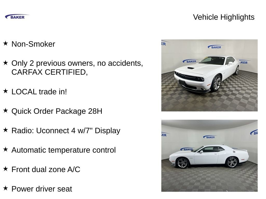 New Price! White Knuckle Clearcoat 2022 Dodge Challenger R/T RWD 8-Speed Automatic HEMI 5.7L V8 Multi Displacement VVT Non-Smoker, Only 2 previous owners, no accidents, CARFAX CERTIFIED,, LOCAL trade in!, Challenger R/T, 2D Coupe, HEMI 5.7L V8 Multi Displacement VVT, 8-Speed Automatic, RWD, White Knuckle Clearcoat, Black Cloth, Apple CarPlay/Android Auto, Automatic temperature control, Front Bucket Seats, Front Center Armrest, Front dual zone A/C, Houndstooth Cloth Performance Seats, Integrated Voice Command w/Bluetooth, ParkView Rear Back-Up Camera, Power driver seat, Quick Order Package 28H, Radio: Uconnect 4 w/7 Display, Wheels: 20 x 8.0 Satin Carbon Aluminum.