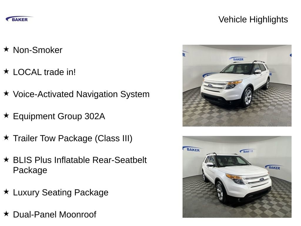 New Price! White Platinum Clearcoat Metallic 2013 Ford Explorer Limited 4WD 6-Speed Automatic with Select-Shift 3.5L 6-Cylinder SMPI DOHC Non-Smoker, LOCAL trade in!, Explorer Limited, 4D Sport Utility, 3.5L 6-Cylinder SMPI DOHC, 4WD, White Platinum Clearcoat Metallic, Medium Light Stone Leather, 20 Sparkle Nickel Painted Aluminum Wheels, 4.7 Pin Wiring Harness, Active Park Assist, Adaptive Cruise Control & Collision Warning, BLIS Blind Spot Information System, BLIS Plus Inflatable Rear-Seatbelt Package, Dual-Panel Moonroof, Engine Oil Cooler, Equipment Group 302A, Heated Steering Wheel, HID Headlamps w/Auto High Beams, Inflatable Rear Seatbelts, Lane Departure Warning & Lane Keep Assist, Luxury Seating Package, Power Liftgate, Power Tilt/Telescoping Steering Wheel, Rain Sensing Wipers, Trailer Tow Package (Class III), Voice-Activated Navigation System.CALL US TODAY 6168373800. Recent Arrival!Awards:* Ward's 10 Best Engines * 2013 KBB.com 5-Year Cost to Own Awards * 2013 KBB.com Brand Image AwardsReviews:* If youâre seeking the room and versatility of a big SUV, but donât like the idea of a poor-handling, fuel-thirsty land barge thatâs nearly impossible to park, Fordâs 2013 Explorer deserves a good look. Additionally, the Explorer has a beautifully-designed interior and is an IIHS Top Safety Pick. Source: KBB.com* Upscale cabin; abundant high-tech features; excellent ride/handling balance; excellent crash test safety scores; available fuel-efficient turbocharged four-cylinder. Source: Edmunds