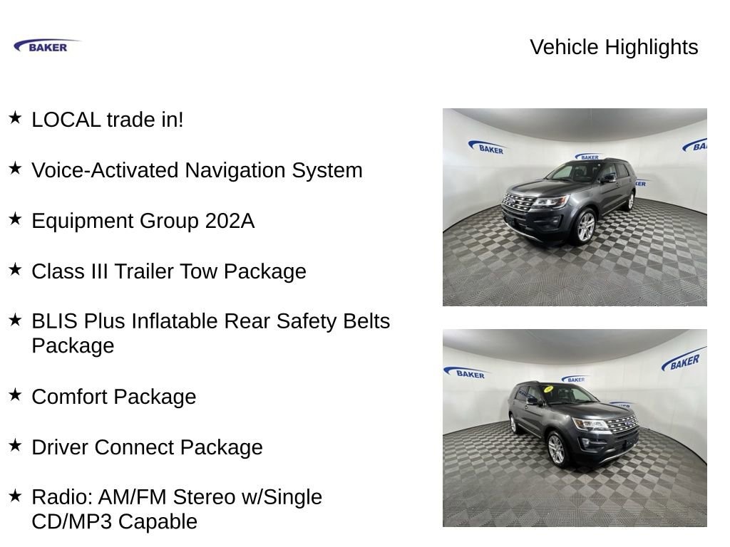 Magnetic Metallic 2016 Ford Explorer XLT 4WD 6-Speed Automatic with Select-Shift 3.5L 6-Cylinder SMPI DOHC LOCAL trade in!, Explorer XLT, 4D Sport Utility, 3.5L 6-Cylinder SMPI DOHC, 4WD, Magnetic Metallic, Ebony Black w/Perf Leather-Trimmed Heated/Cooled Bucket Seats, 20 Polished Aluminum Wheels, Auto-Dimming Driver's Sideview Mirror, BLIS Blind Spot Information System, BLIS Plus Inflatable Rear Safety Belts Package, Class III Trailer Tow Package, Comfort Package, Driver Connect Package, Dual-Zone Electronic Automatic Temperature Ctrl, Equipment Group 202A, Forward Sensing System, Hands-Free Liftgate, Inflatable Rear Seatbelts, Radio: AM/FM Stereo w/Single CD/MP3 Capable, Remote Start, SYNC, Twin Panel Moonroof, Voice-Activated Navigation System.CALL US TODAY 6168373800. Recent Arrival!Awards:* 2016 KBB.com Best Buy Awards Finalist * 2016 KBB.com 5-Year Cost to Own Awards * 2016 KBB.com Brand Image AwardsReviews:* High-tech features are plentiful and easy to use; cargo space is generous, even behind the third row; turbocharged V6 engine delivers plentiful power; quiet and comfortable on the highway. Source: Edmunds