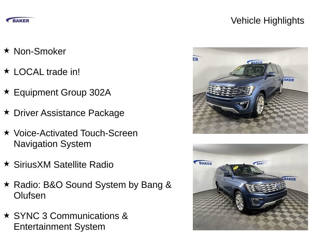 New Price! Blue Metallic 2019 Ford Expedition Max Limited 4WD 10-Speed Automatic EcoBoost 3.5L V6 GTDi DOHC 24V Twin Turbocharged Non-Smoker, LOCAL trade in!, Expedition Max Limited, 4D Sport Utility, EcoBoost 3.5L V6 GTDi DOHC 24V Twin Turbocharged, 10-Speed Automatic, 4WD, Blue Metallic, Medium Stone w/Heated & Cooled Leather Front Bucket Seats or Equipment Group 300A or Equipment Group 301A or Equipment Group 302A, 22 Polished Aluminum Wheels, 360-Degree Camera w/Split View, Adjustable pedals, AppLink/Apple CarPlay and Android Auto, Automatic High Beam Headlamps, Automatic temperature control, Driver Assistance Package, Enhanced Active Park Assist System, Equipment Group 302A, Exterior Parking Camera Rear, Front dual zone A/C, Heated front seats, Heated rear seats, Heated steering wheel, Lane-Keeping System, LED Headlamps & Fog Lamps, Memory seat, Panoramic Vista Roof, Pedal memory, Power driver seat, Power Liftgate, Power passenger seat, Pre-Collision Assist, Radio: B&O Sound System by Bang & Olufsen, Rain-Sensing Front Wipers, SiriusXM Satellite Radio, SYNC 3 Communications & Entertainment System, Ventilated front seats, Voice-Activated Touch-Screen Navigation System.