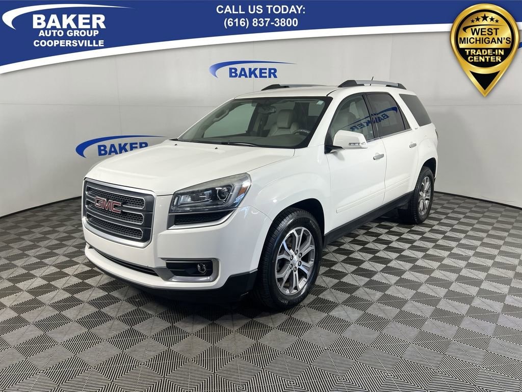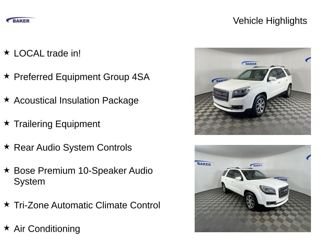 Summit White 2013 GMC Acadia SLT-1 AWD 6-Speed Automatic 3.6L V6 SIDI LOCAL trade in!, Acadia SLT-1, 3.6L V6 SIDI, 6-Speed Automatic, AWD, Summit White, Light Titanium Leather, 19 x 7.5 Aluminum (4) Wheels, 2-Way Power Front Passenger Seat, 7-Passenger Seating (2-2-3 Seating Configuration), 8-Way Power Driver Seat, Acoustical Insulation Package, Air Conditioning, Automatic temperature control, Body-Color Bodyside Moldings, Body-Color Heated Power-Adjustable Outside Mirrors, Bose Premium 10-Speaker Audio System, Carpeted Removable Front 2nd & 3rd Row Floor Mats, Dual Downturn Tailpipe Exhaust, Exterior Parking Camera Rear, Heated front seats, Heavy-Duty Cooling System, Inside Rear-View Auto-Dimming Mirror, Integral Spotter Blind-Zone Mirrors, Leather-Wrapped Steering Wheel, Power driver seat, Power passenger seat, Power Rear Liftgate Body, Power Windows w/Driver Express-Down, Preferred Equipment Group 4SA, Rear Audio System Controls, Remote Vehicle Start, Trailer Hitch, Trailering Equipment, Tri-Zone Automatic Climate Control, Universal Home Remote.CALL US TODAY 6168373800. Recent Arrival!Awards:* 2013 IIHS Top Safety PickReviews:* If you need room for eight, a massive cargo bay or some combination of both, but you donât want a fuel-thirsty full-size SUV or dowdy minivan, check out the 2013 GMC Acadia. Source: KBB.com* Compliant ride; seating for up to eight passengers; massive cargo area. Source: Edmunds