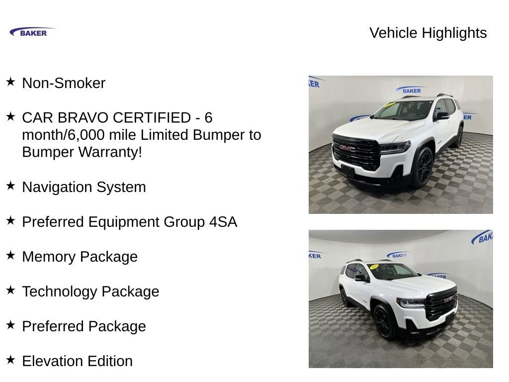 New Price! White Frost Tricoat 2023 GMC Acadia SLT AWD 9-Speed Automatic 3.6L V6 SIDI Non-Smoker, CAR BRAVO CERTIFIED - 6 month/6,000 mile Limited Bumper to Bumper Warranty!, Acadia SLT, 3.6L V6 SIDI, 9-Speed Automatic, AWD, White Frost Tricoat, Jet Black Leather, 20 Machined Aluminum Wheels, 3rd row seats: split-bench, 4-Way Manual Passenger Seat Adjuster, 6-Passenger (2-2-2 Seating Configuration), 8-Way Power Driver Seat Adjuster, 8-Way Power Passenger Seat Adjuster, Apple CarPlay/Android Auto, Automatic temperature control, Bose Premium 8-Speaker Audio System Feature, Elevation Edition, Front dual zone A/C, Gloss Black Roof Rails, HD Surround Vision, Heads-Up Display, Heated & Ventilated Driver & Front Passenger Seats, Heated Driver & Front Passenger Seats, Heated front seats, Heated Rear Outboard Seating Positions, Heated Steering Wheel, Luxury Package, Memory Package, Navigation System, Perforated Leather-Appointed Seat Trim, Power Driver Lumbar Control Seat Adjuster, Power driver seat, Power Liftgate, Power Passenger Lumbar Control Seat Adjuster, Power-Adjustable Body-Color Outside Heated Mirrors, Preferred Equipment Group 4SA, Preferred Package, Radio: AM/FM 8 Diagonal Multi-Touch Navigation, SiriusXM w/360L, Technology Package, Wireless Apple CarPlay/Wireless Android Auto.CALL US TODAY 6168373800. 19/26 City/Highway MPG