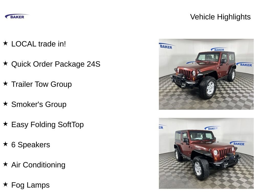 Red Rock Crystal Pearlcoat 2007 Jeep Wrangler X 4WD 4-Speed Automatic VLP 3.8L V6 SMPI LOCAL trade in!, Wrangler X, 3.8L V6 SMPI, 4-Speed Automatic VLP, 4WD, Red Rock Crystal Pearlcoat, Dark/Medium Slate Gray Vinyl, 16 x 7.0 Aluminum Wheels, 16 x 7.0 Luxury Styled Steel Wheels, 4.10 Axle Ratio, 6 Speakers, Air Conditioning, Cigar Lighter, Class II Receiver Hitch, Cloth Low-Back Bucket Seats, Driver Height Adjuster Seat, Easy Folding SoftTop, Fog Lamps, Full Length Floor Console, Leather Wrapped Steering Wheel, Quick Order Package 24S, Removable Ash Tray, Smoker's Group, Speed Control, Tow Hooks (2 front/1 rear), Trailer Tow Group, Trailer Tow w/4-Pin Connector Wiring.