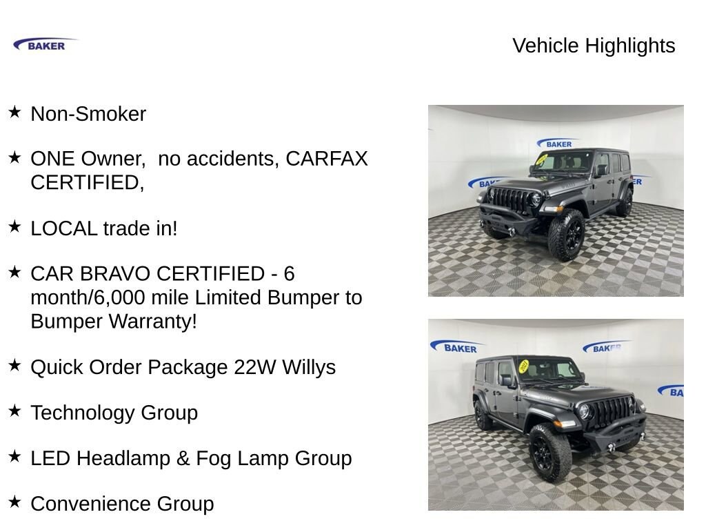 New Price! Granite Crystal Metallic Clearcoat 2021 Jeep Wrangler Unlimited Willys 4WD 8-Speed Automatic 2.0L I4 DOHC Non-Smoker, ONE Owner, no accidents, CARFAX CERTIFIED,, LOCAL trade in!, CAR BRAVO CERTIFIED - 6 month/6,000 mile Limited Bumper to Bumper Warranty!, Wrangler Unlimited Willys, 2.0L I4 DOHC, 8-Speed Automatic, 4WD, Granite Crystal Metallic Clearcoat, Black Cloth, 4-Wheel Drive Swing Gate Decal, 7.0 Touchscreen Display, 8.4 Radio & Premium Audio Group, Air Conditioning w/Auto Temperature Control, Air Filtering, Alpine Premium Audio System, Anti-Spin Differential Rear Axle, Apple CarPlay, Auto-Dimming Rear-View Mirror, Automatic Headlamps, Black 3-Piece Hard Top, Black Grille, Black Trail Rated Badge, Cold Weather Group, Convenience Group, Deep Tint Sunscreen Windows, Freedom Panel Storage Bag, Front 1-Touch Down Power Windows, Google Android Auto, Heated Front Seats, Heated Steering Wheel, LED Headlamp & Fog Lamp Group, Matte Black Jeep Badge, Mold In Color Bumper w/Gloss Black, MOPAR All-Weather Floor Mats, No Soft Top, ParkView Rear Back-Up Camera, Power Heated Mirrors, Quick Order Package 22W Willys, Radio: Uconnect 4 w/7 Display, Rear Window Defroster, Rear Window Wiper/Washer, Remote Keyless Entry, Speed Sensitive Power Locks, Sun Visors w/Illuminated Vanity Mirrors, Technology Group, Universal Garage Door Opener, USB Host Flip, Wheels: 17 x 7.5 Moab Black Aluminum, Willys, Willys Hood Decal, Wrangler Decal.CALL US TODAY 6168373800. Recent Arrival!