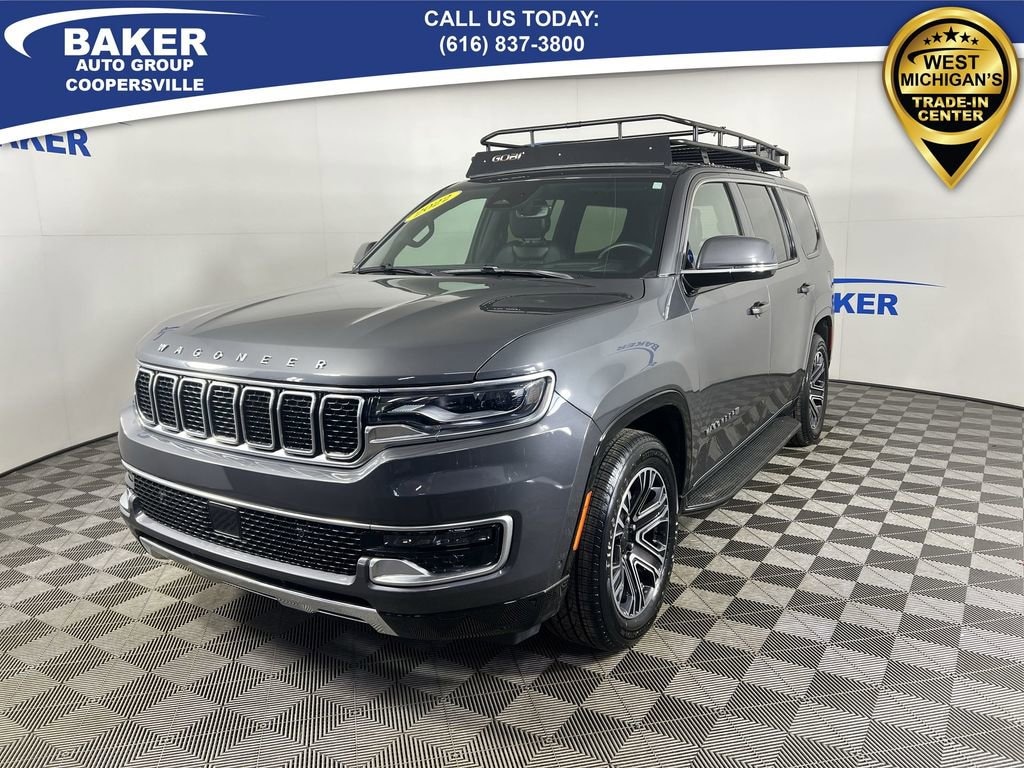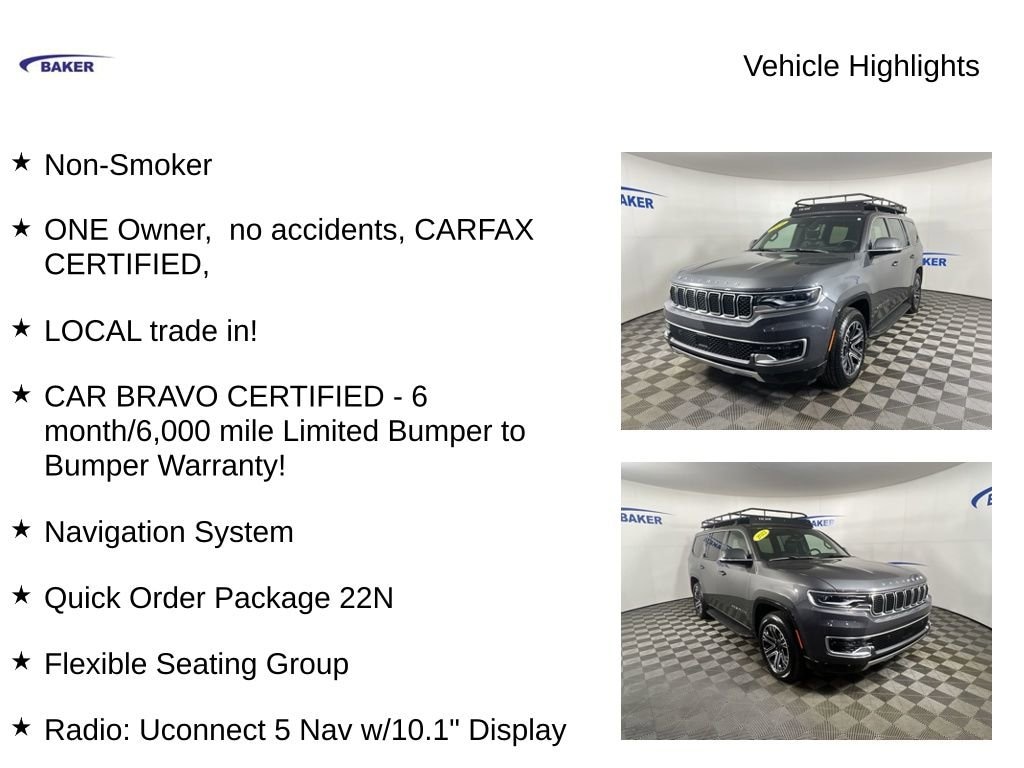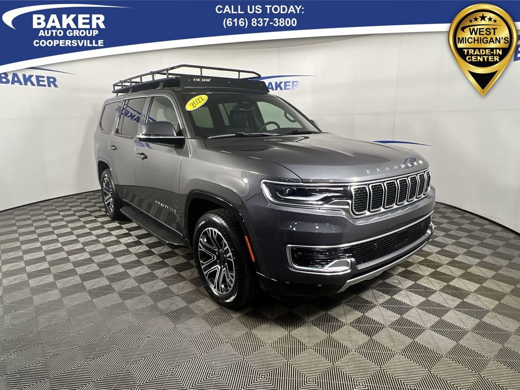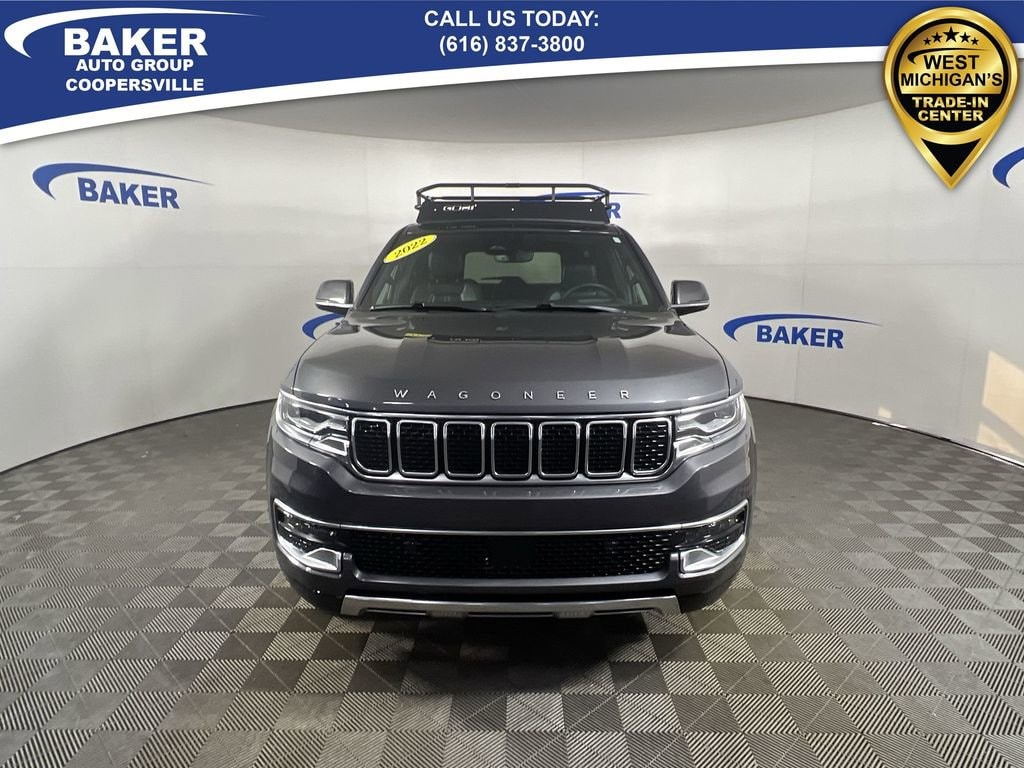 Baltic Gray Metallic Clearcoat 2022 Jeep Wagoneer Series III 4WD 8-Speed Automatic 5.7L V8 Non-Smoker, ONE Owner, no accidents, CARFAX CERTIFIED,, LOCAL trade in!, CAR BRAVO CERTIFIED - 6 month/6,000 mile Limited Bumper to Bumper Warranty!, Wagoneer Series III, 5.7L V8, 8-Speed Automatic, 4WD, Baltic Gray Metallic Clearcoat, Black Leather, 10 Speakers, 7-Passenger Seating, Adjustable pedals, Automatic temperature control, Exterior Parking Camera Rear, Flexible Seating Group, Floor Console w/Cupholder, Front dual zone A/C, Front Passenger Interactive Display, Heads-Up Display, Heated front seats, Heated rear seats, Heated steering wheel, Memory seat, Navigation System, Pedal memory, Power driver seat, Power Liftgate, Power Tip/Slide Recline 2nd Row Buckets, Quick Order Package 22N, Radio: Uconnect 5 Nav w/10.1 Display, Rear dual zone A/C, Reclining 3rd row seat, Ventilated front seats, Wheels: 20 x 9.0 Premium 2 Aluminum.