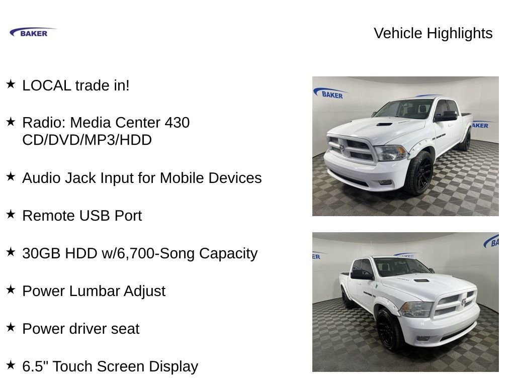 New Price! Bright White Clearcoat 2011 Ram 1500 Sport 4WD 5-Speed Automatic HEMI 5.7L V8 Multi Displacement VVT LOCAL trade in!, 1500 Sport, HEMI 5.7L V8 Multi Displacement VVT, 5-Speed Automatic, 4WD, Bright White Clearcoat, Dark Slate Gray Cloth, 20 x 9 Chrome Clad Aluminum Wheels, 30GB HDD w/6,700-Song Capacity, 6.5 Touch Screen Display, Audio Jack Input for Mobile Devices, Power driver seat, Power Lumbar Adjust, Radio: Media Center 430 CD/DVD/MP3/HDD, Remote USB Port, Uconnect Voice Command w/Bluetooth.