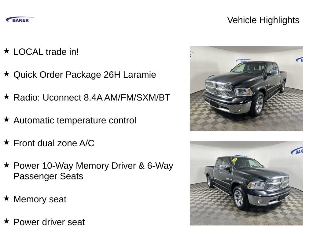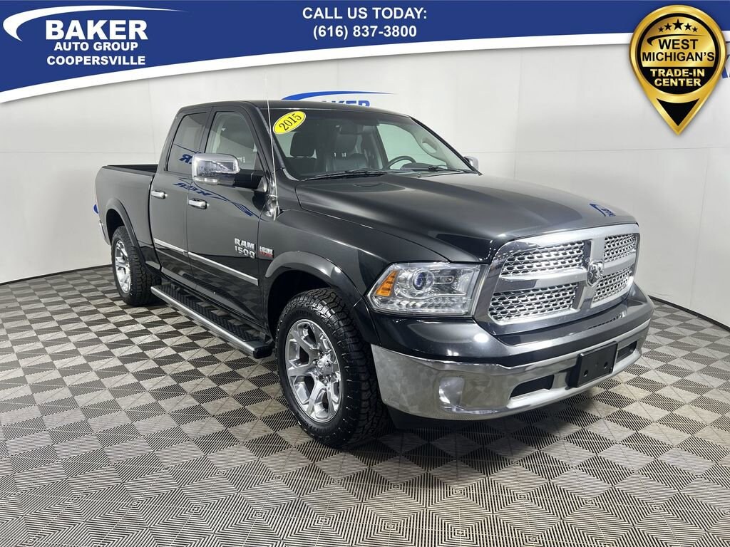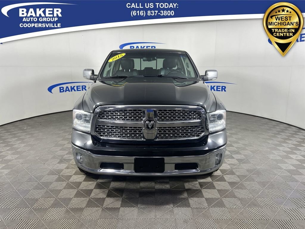 Brilliant Black Crystal Pearlcoat 2015 Ram 1500 Laramie 4WD 8-Speed Automatic HEMI 5.7L V8 Multi Displacement VVT LOCAL trade in!, 1500 Laramie, HEMI 5.7L V8 Multi Displacement VVT, 8-Speed Automatic, 4WD, Brilliant Black Crystal Pearlcoat, Black w/Laramie Limited Leather Bucket Seats, 115V Auxiliary Power Outlet, 20 x 9 Chrome Clad Aluminum Wheels, Adjustable pedals, Automatic temperature control, Front dual zone A/C, Heated Front Seats, Heated steering wheel, Memory seat, ParkView Rear Back-Up Camera, Pedal memory, Power 10-Way Memory Driver & 6-Way Passenger Seats, Power driver seat, Power passenger seat, Quick Order Package 26H Laramie, Radio: Uconnect 8.4A AM/FM/SXM/BT, Ventilated Front Seats.