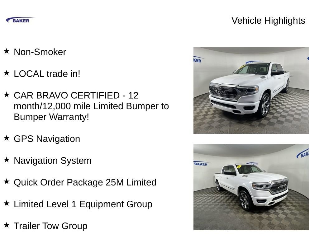 New Price! Ivory White Tri-Coat Pearlcoat 2019 Ram 1500 Limited 4WD 8-Speed Automatic HEMI 5.7L V8 Multi Displacement VVT Non-Smoker, LOCAL trade in!, CAR BRAVO CERTIFIED - 12 month/12,000 mile Limited Bumper to Bumper Warranty!, 1500 Limited, HEMI 5.7L V8 Multi Displacement VVT, 4WD, Ivory White Tri-Coat Pearlcoat, Indigo/Frost Leather, 12 Touchscreen Display, 3.92 Rear Axle Ratio, Adaptive Cruise Control w/Stop & Go, Adjustable pedals, Advanced Brake Assist, Apple CarPlay/Android Auto, Automatic temperature control, Body Color Bumper Group, Body Color Front Bumper, Body Color Rear Bumper w/Step Pads, Dome Dual LED Reading Lamp, Dual-Pane Panoramic Sunroof, Front dual zone A/C, Full Speed Forward Collision Warning Plus, Google Android Auto, GPS Navigation, harman/kardon 19 Speaker Premium Sound, Heated front seats, Heated rear seats, Heated steering wheel, Lane Keep Assist, LED Dome/Reading Lamp, Limited Level 1 Equipment Group, Memory seat, Navigation System, Parallel & Perp Park Assist w/Stop, ParkView Rear Back-Up Camera, Pedal memory, Power Chrome Trailer Tow Mirrors, Power driver seat, Power passenger seat, Quick Order Package 25M Limited, Radio: Uconnect 12 w/Navigation, SiriusXM Satellite Radio, SiriusXM Traffic Plus, SiriusXM Travel Link, SiriusXM w/360L, Trailer Brake Control, Trailer Tow Group, Trailer Tow Mirrors, USB Host Flip, Ventilated front seats, Ventilated Rear Seats, Wheels: 22 x 9 Polish/Painted w/Inserts.