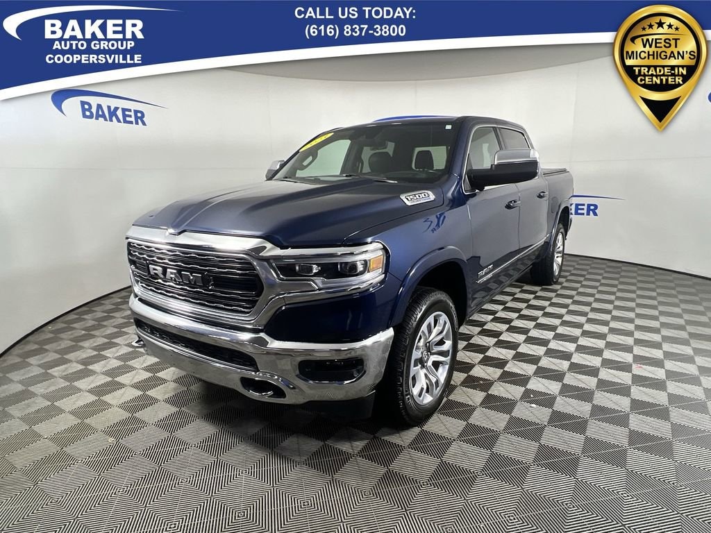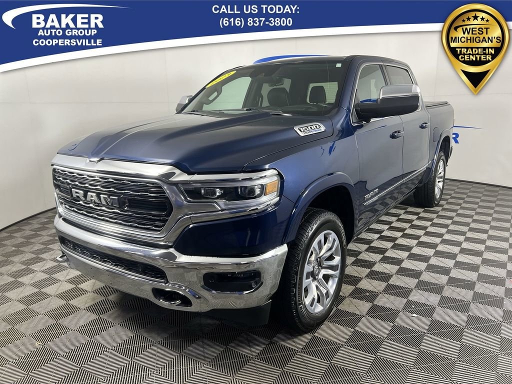 Patriot Blue Pearlcoat 2023 Ram 1500 Limited 4WD 8-Speed Automatic HEMI 5.7L V8 Multi Displacement VVT eTorque ONE Owner, no accidents, CARFAX CERTIFIED,, LOCAL trade in!, CAR BRAVO BUDGET CERTIFIED - 30 day/1,000 mile Limited Powertrain Warranty!, 1500 Limited, HEMI 5.7L V8 Multi Displacement VVT eTorque, 8-Speed Automatic, 4WD, Patriot Blue Pearlcoat, Black Leather, 3.92 Rear Axle Ratio, Active Noise Control System, Adaptive Cruise Control w/Stop & Go, Adjustable pedals, Apple CarPlay/Android Auto, Audio memory, Automatic temperature control, Bed Utility Group, Digital Rearview Mirror, Driver Seat Memory, Dual Rear Exhaust w/Bright Tips, Exterior Mirrors w/Memory, Front dual zone A/C, Heads-Up Display, Heated Front Seats, Heated rear seats, Heated Second Row Seats, Heated Steering Wheel, Lane Keep Assist, LED CHMSL Lamp, Limited Level 1 Equipment Group, Memory seat, MOPAR 4 Adjustable Cargo Tie-Down Hooks, MOPAR Spray In Bedliner, Navigation System, Parallel & Perp Park Assist w/Stop, ParkSense Front/Rear Park Assist w/Stop, ParkView Rear Back-Up Camera, Pedal memory, Pedestrian Emergency Braking, Pick-Up Box Lighting, Power 4-Way Driver Lumbar Adjust, Power 4-Way Passenger Lumbar Adjust, Power 8-Way Driver & Passenger Seats, Power driver seat, Power passenger seat, Power Running Boards, Quick Order Package 27M Limited, Radio: Uconnect 5 Nav w/12.0 Display, Surround View Camera System, Tailgate Ajar Warning Lamp, Trailer Brake Control, Trailer Light Check, Trailer Reverse Steering Control, Trailer Tire Pressure Monitoring System, Trailer Tow Group, Ventilated Front Seats, Ventilated Rear Seats, Wheels: 20 x 9 Aluminum Painted/Polished, Wireless Charging Pad.