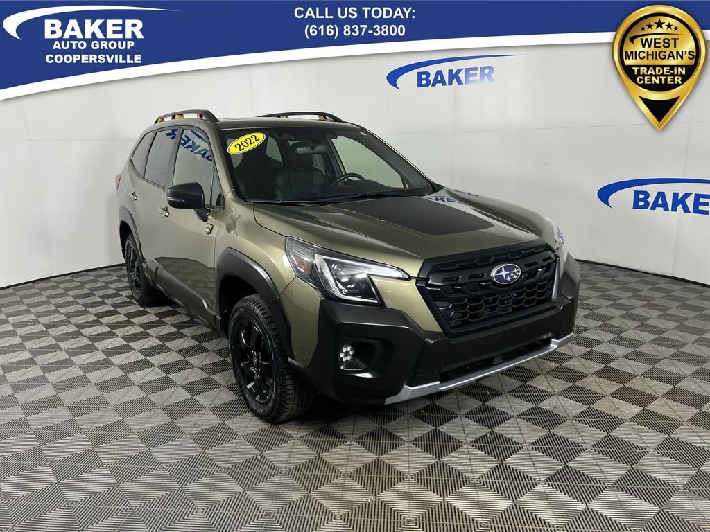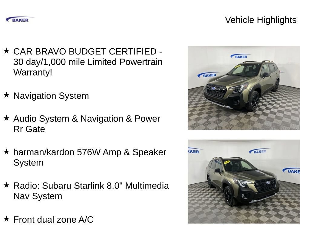 New Price! Autumn Green Metallic 2022 Subaru Forester Wilderness AWD Lineartronic CVT 2.5L 4-Cylinder DOHC 16V CAR BRAVO BUDGET CERTIFIED - 30 day/1,000 mile Limited Powertrain Warranty!, Forester Wilderness, AWD, Autumn Green Metallic, Gray Premium Synthetic, Audio System & Navigation & Power Rr Gate, Automatic temperature control, Exterior Parking Camera Rear, Front dual zone A/C, harman/kardon 576W Amp & Speaker System, Heated front seats, Navigation System, Power driver seat, Power moonroof: Panoramic, Power Rear Gate, Radio: Subaru Starlink 8.0 Multimedia Nav System, STARLINK/Apple CarPlay/Android Auto, Textured StarTex Upholstery, Wheels: 17 x 7.0J Matte Black Machine Finish Alloy.